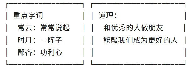 1.小结:今天我们读了《世说新语》里最短、也最有名的一个小故事,知道了「常云」两个字,就告诉我们黄叔度对周子居的影响有多深——好朋友就像一面镜子,能帮我们找到自己的不足,让我们变成更好的人,值得我们常常想起、常常说起。