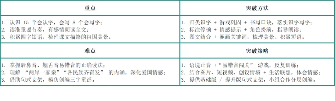 文本定位:本文是一首朗朗上口的三字童谣,以简洁明快的语言勾勒神州大地的壮美山河,诉说两岸同胞的血脉亲情和各民族的团结情谊,是落实文化自信「爱国教育」的核心文本,契合新课标低年级 “积累中华优秀传统文化童谣,培养爱祖国、爱民族的情感” 要求。① 识字写字:重点突破后鼻音 / 翘舌音生字,掌握形声字、形近字识字方法,规范书写 8 个会写字;② 朗读能力:读准童谣节奏,读出不同小节的情感(赞美、雄伟、深情、奋进);③ 积累运用:积累 “山川美、情谊浓、齐奋发、共繁荣” 等四字短语,模仿童谣句式创编;④ 价值渗透:感受祖国山河之美,理解台湾是祖国不可分割的一部分,体会各民族团结的意义,树立爱国情怀。文本特点:三字句式、韵律感强,插图直观呈现祖国美景,适合 “情境教学 + 可视化感知 + 朗读积累”。2. 学情精准画像(规避教学盲区)