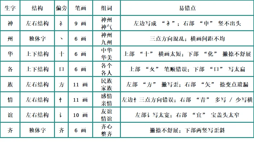 ① 强调易错点:“族” 的右部 “矢” 捺变点,“谊” 的右部 “宜” 宝盖头要宽,“情” 的忄三点方向;② 教师范写,学生描红临写,教师巡视,重点纠正笔顺和结构错误;5. 课堂小结 + 作业(3 分钟)