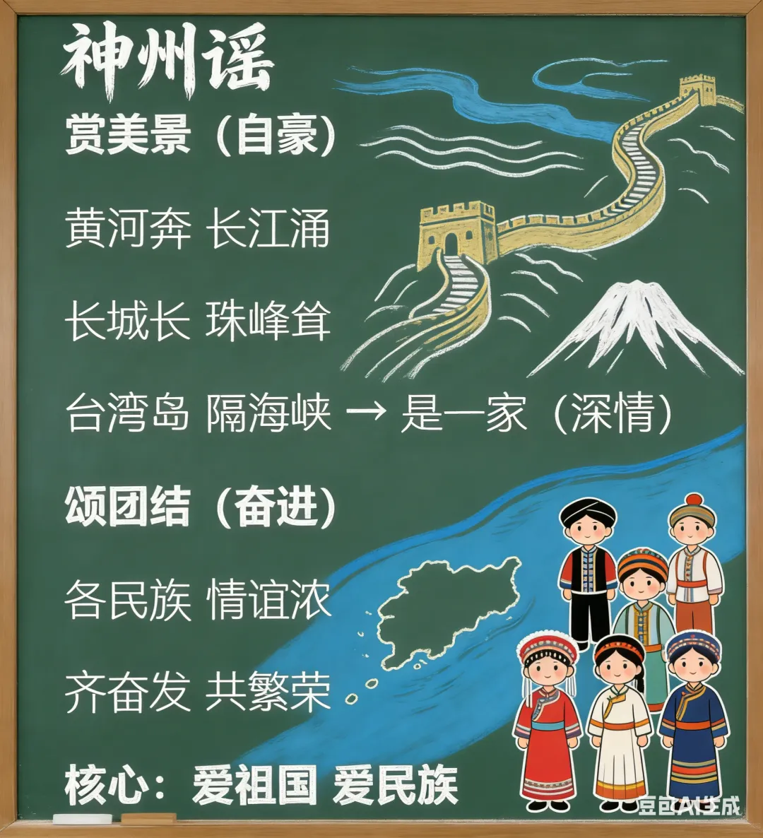 环节 1:精读第 3 小节,体会两岸亲情(5 分钟)① 出示台湾岛与大陆的地图图片,指名朗读第 3 小节,引导学生理解 “隔海峡、是一家” 的含义:台湾岛虽与大陆隔了一道海峡,但自古以来是祖国不可分割的一部分,两岸人民是一家人;② 指导朗读:语气要深情、温柔,读出对台湾岛的牵挂,重音落在 “是一家” 上,采用 “指名读 + 全班齐读” 的方式。环节 2:精读第 4 小节,理解民族团结(6 分钟)① 播放 56 个民族的风情短视频,提问:“我们国家有多少个民族?各民族之间的感情怎么样?” 引导学生理解 “情谊浓”;② 结合 “齐奋发,共繁荣”,提问:“各民族同胞要一起做什么?” 引导学生明白:各民族齐心协力、努力奋斗,让祖国变得更加兴盛美好;③ 指导朗读:读出奋发向上、充满希望的气势,重音落在 “浓、齐、共” 上,全班起立朗读,读出决心。① 教师标注停顿和情感提示,范读全文:“我 / 神州,称 / 中华,山川美,/ 可入画(自豪);黄河 / 奔,长江 / 涌,长城 / 长,珠峰 / 耸(雄伟)……”;② 学生配乐朗读,采用 “男女生对读 + 拍手齐读” 的方式,读出童谣的韵律美和不同小节的情感。3. 背诵积累,拓展创编(12 分钟)