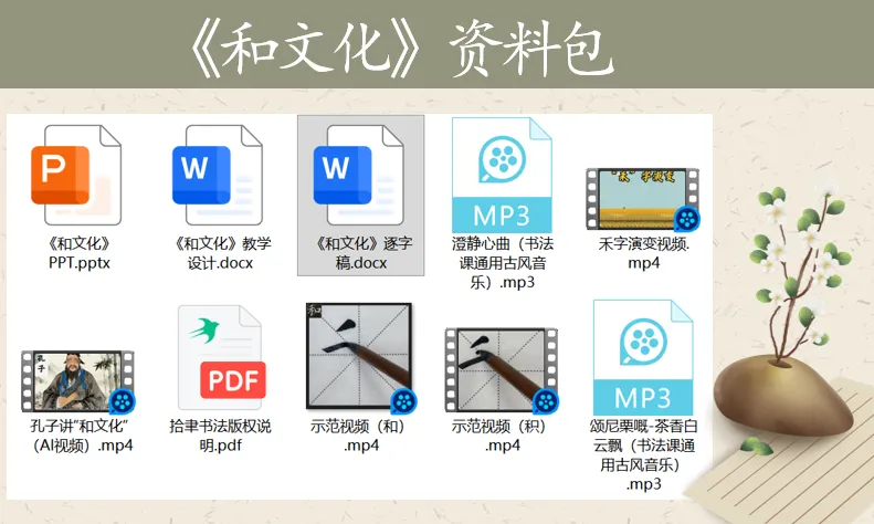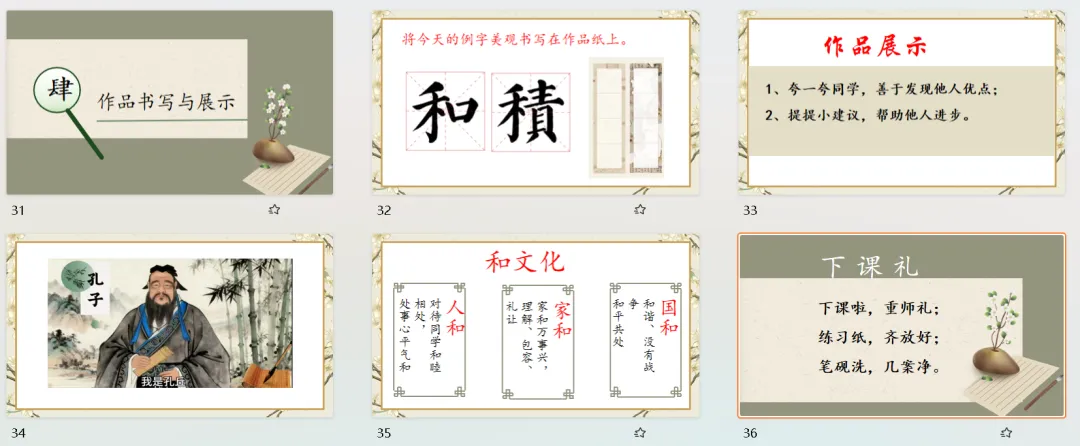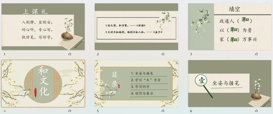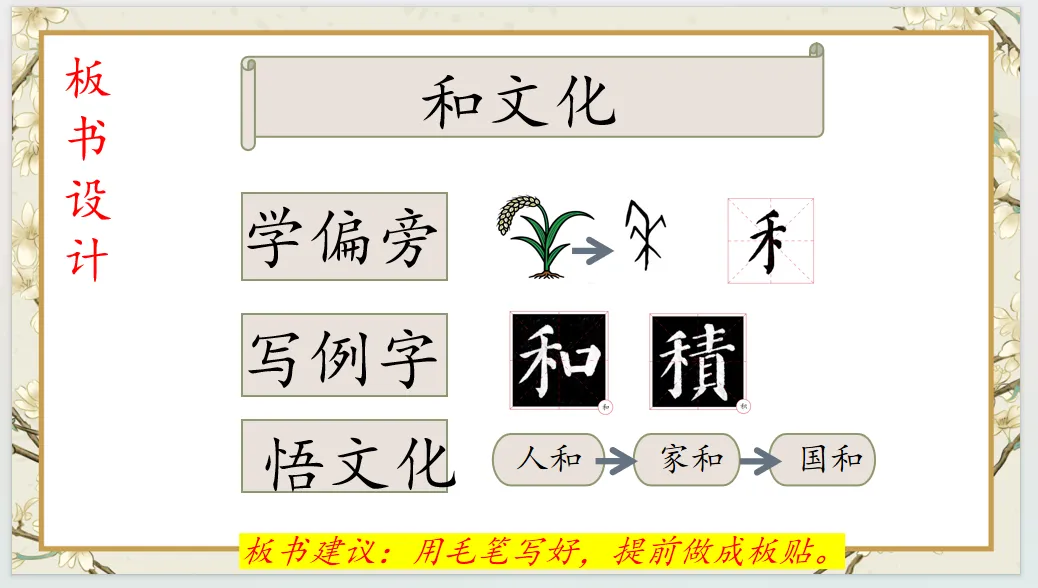 师:你们说得都特别贴合生活,观察得真仔细!其实“和” 不仅在生活里常用,在咱们的经典古籍里也有重要的地位,《论语》中说“礼之用,和为贵”;《孟子》还有一句“天时不如地利,地利不如人和”,这两句话都告诉我们,“和” 是中国人做人、做事的重要道理,今天咱们的书法课,就从写好 “和” 字开始,一起探索藏在 “和” 字里的书法美和文化美,这节课的课题就是 —— 和文化。(板书:和文化)