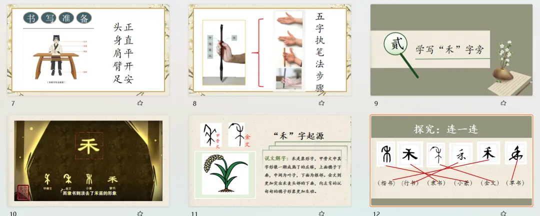 师:太有观察力了!汉字的演变就是这样,从形象的象形字,慢慢变成工整的楷书,这是咱们中华文化的传承。接下来老师给大家出个小任务,屏幕上有楷书、行书、隶书、小篆、金文、草书的“禾” 字,谁能把它们和对应的字体连一连?(展示连线题)
