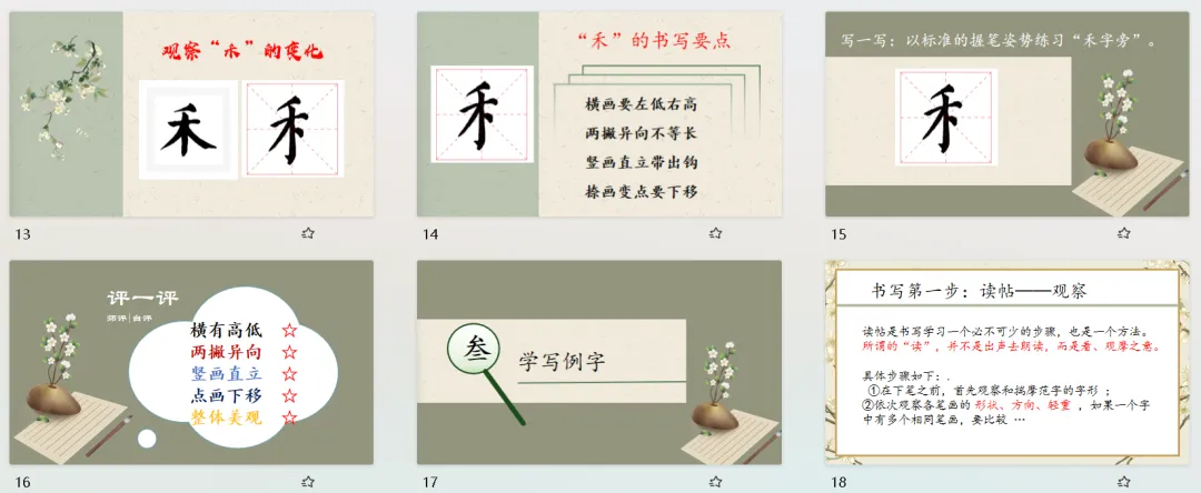 师:你们的眼睛太尖了,一下子就发现了关键!老师把禾字旁的书写要点编成了口诀,咱们一起念一遍:横画要左低右高,两撇异向不等长,竖画直立带出钩,捺画变点要下移。