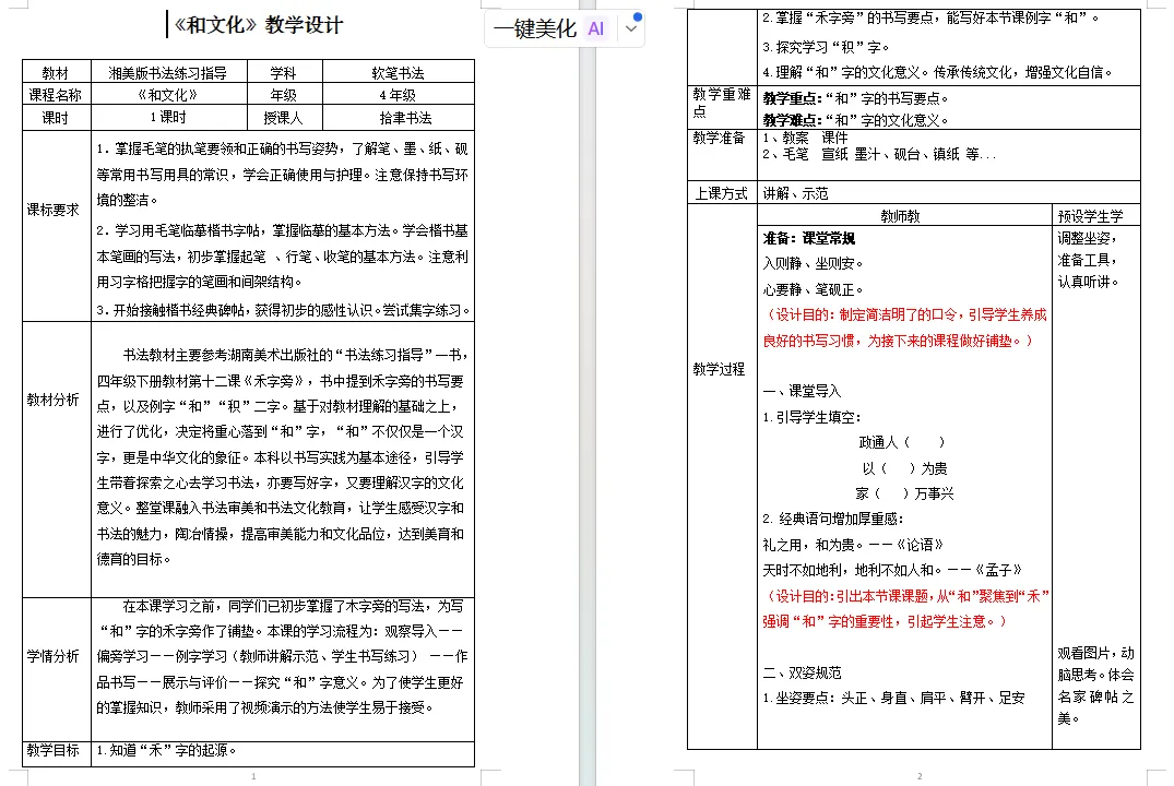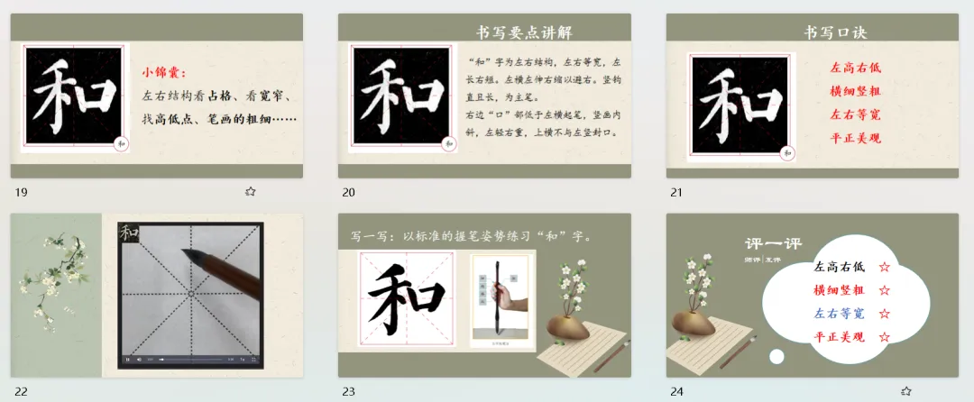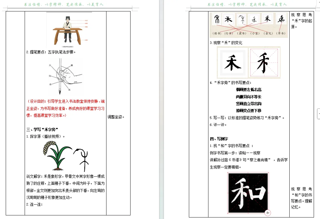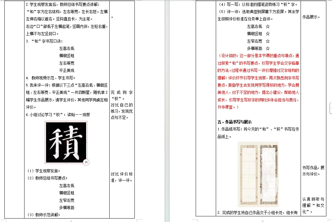 教材分析:书法教材主要参考湖南美术出版社的“书法练习指导”一书,四年级下册教材第十二课《禾字旁》,书中提到禾字旁的书写要点,以及例字“和”“积”二字。基于对教材理解的基础之上,进行了优化,决定将重心落到“和”字,“和”不仅仅是一个汉字,更是中华文化的象征。本课以书写实践为基本途径,引导学生带着探索之心去学习书法,亦要写好字,又要理解汉字的文化意义。整堂课融入书法审美和书法文化教育,让学生感受汉字和书法的魅力,陶冶情操,提高审美能力和文化品位,达到美育和德育的目标。