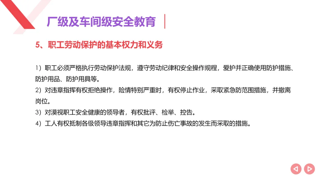 明确权利义务:使员工知悉自身在安全生产中的八大权利(如知情权、拒绝权、紧急避险权等)和四项基本义务(如遵章守纪、正确佩戴防护用品等)