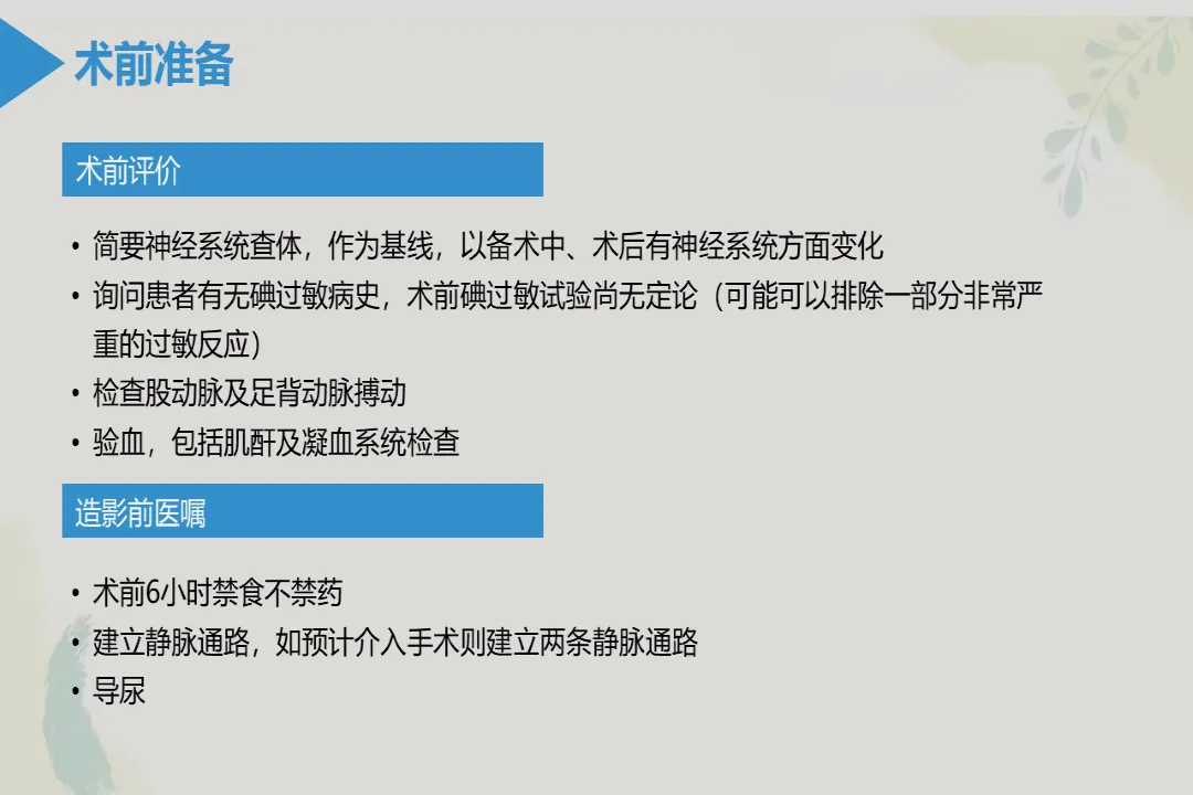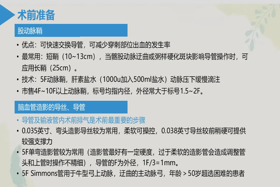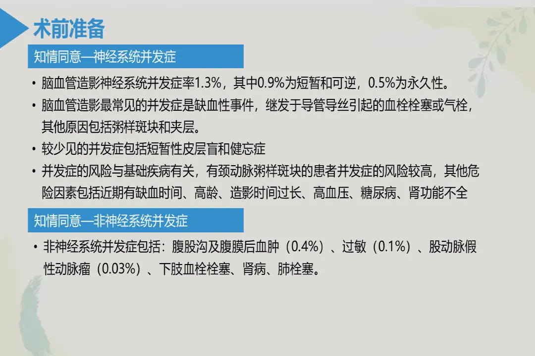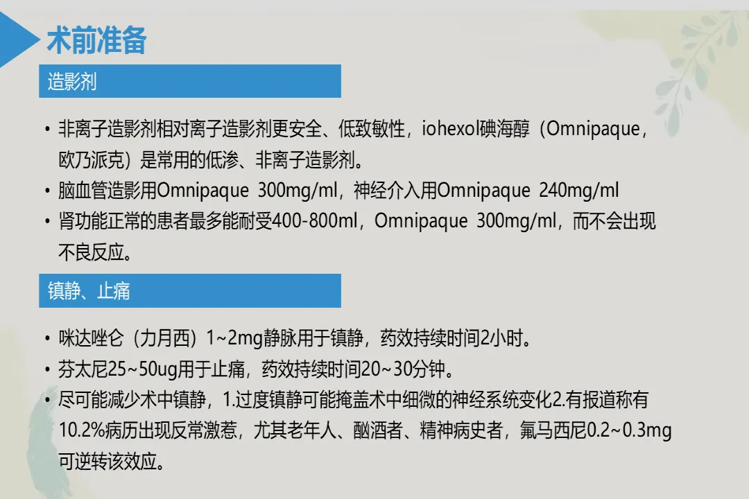 先讲术前准备。首先要做知情同意,神经系统并发症率 1.3%,大部分可逆,非神经系统的有血肿、过敏这些,风险和基础病有关。然后术前评价,查神经系统、碘过敏史,摸股动脉和足背动脉,验肌酐和凝血。医嘱方面,术前 6 小时禁食,建静脉通路,必要时导尿。造影剂用非离子的,碘海醇常用,造影用 300mg/ml,介入用 240mg/ml。镇静止痛用咪达唑仑和芬太尼,别过度镇静,老年人可能反常激惹,用氟马西尼逆转。还有导丝导管,术前必须排气,5F 单弯管常用,股动脉鞘选短鞘,肝素盐水滴注。