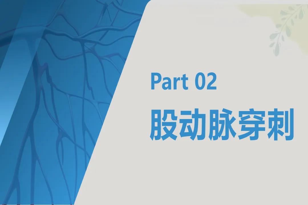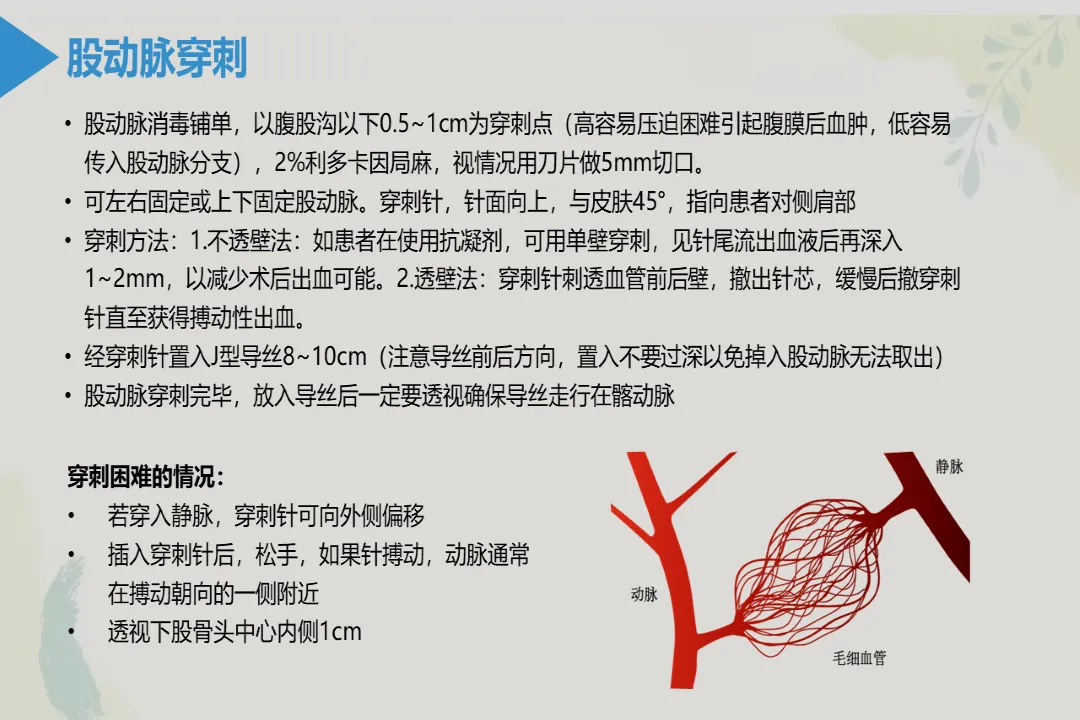 接下来是股动脉穿刺。穿刺点在腹股沟下 0.5-1cm,利多卡因局麻,穿刺针和皮肤 45 度。有不透壁和透壁两种方法,置 J 型导丝 8-10cm,透视确认导丝位置。穿刺困难的话,穿静脉就往外侧偏,也可以看股骨头中心内侧 1cm 定位。