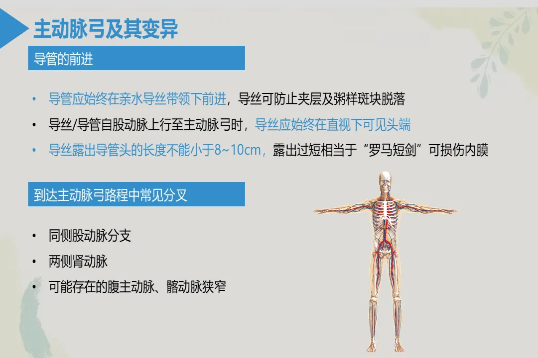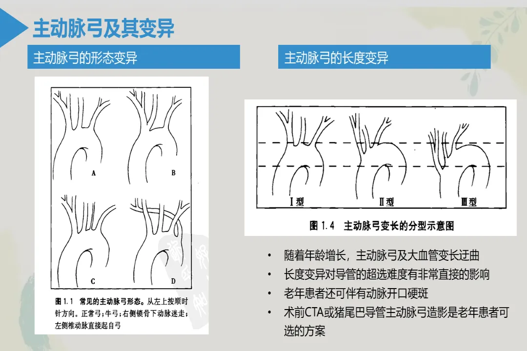 然后是主动脉弓及其变异。导管要跟着亲水导丝走,导丝头端始终可见,露出导管头 8-10cm 以上。上行会遇到股动脉分支、肾动脉这些分叉。主动脉弓有形态和长度变异,老年人血管会迂曲,还有硬斑,术前可以做 CTA 或造影。