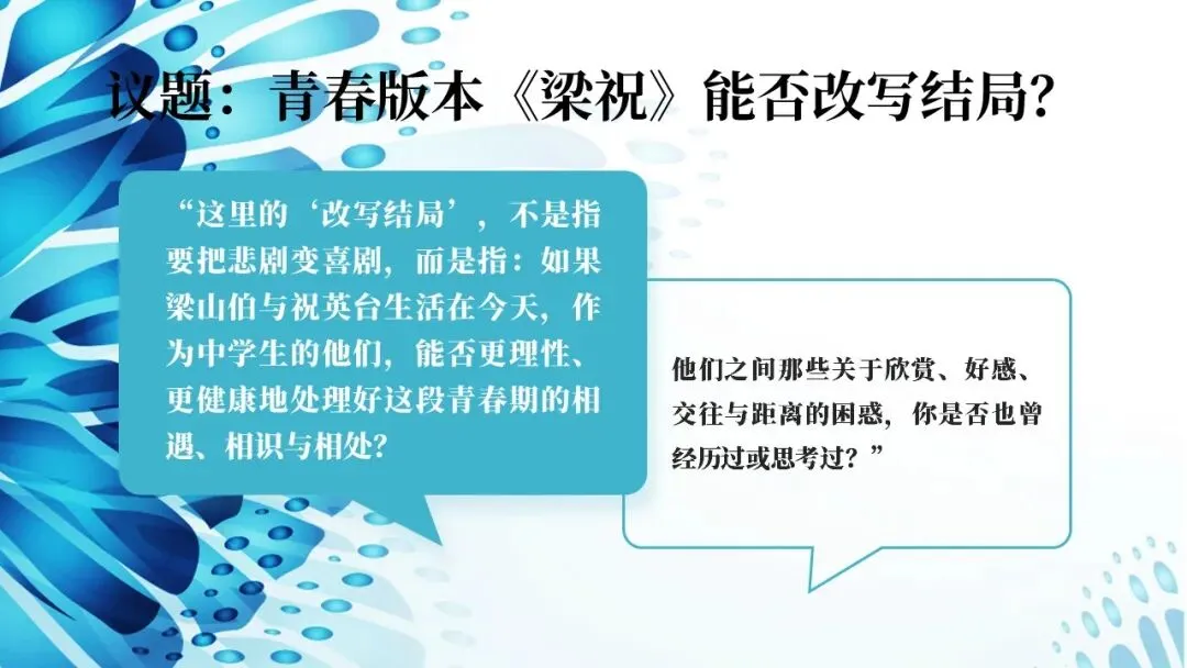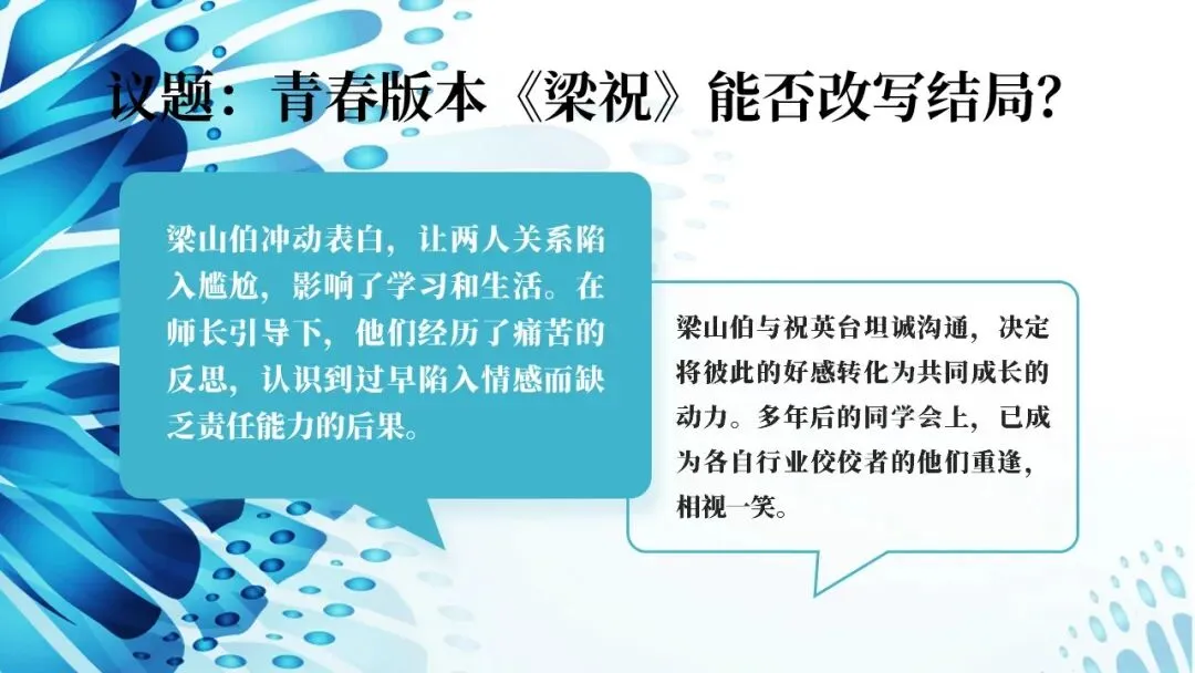 道法七下《男生女生》以 “青春版《梁祝》能否改写结局” 为核心议题,引导学生代入思考:如果梁山伯与祝英台是当代中学生,该如何理性、健康地处理青春期的相遇与相处,从而正视青春期的情感困惑。