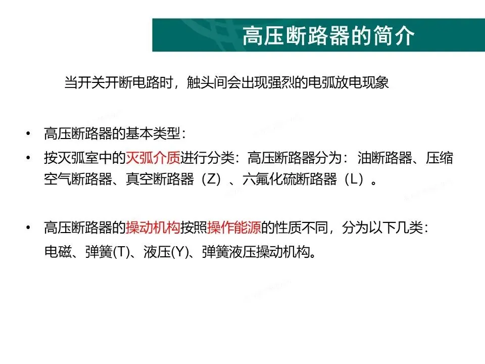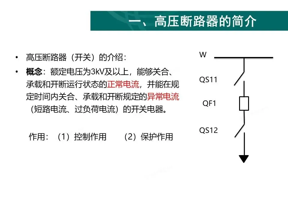 •概念:额定电压为3kV及以上,能够关合、承载和开断运行状态的正常电流,并能在规定时间内关合、承载和开断规定的异常电流(短路电流、过负荷电流)的开关电器。