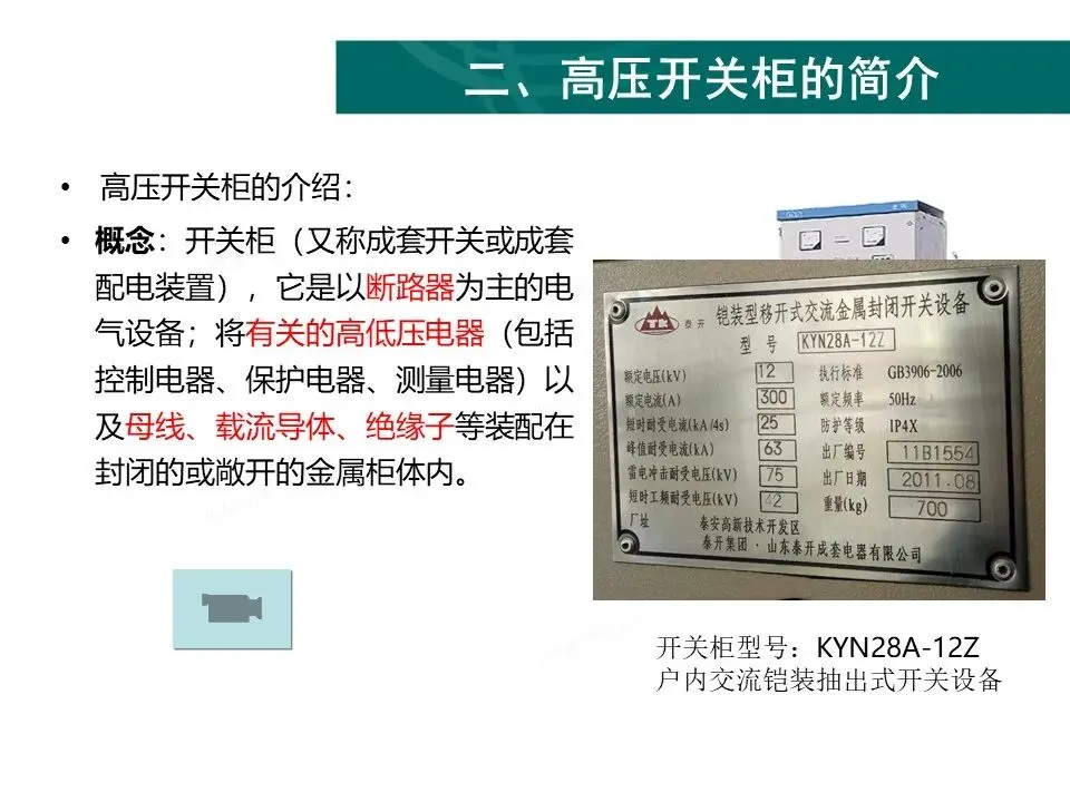 •概念:开关柜(又称成套开关或成套配电装置),它是以断路器为主的电气设备;将有关的高低压电器(包括控制电器、保护电器、测量电器)以及母线、载流导体、绝缘子等装配在封闭的或敞开的金属柜体内。