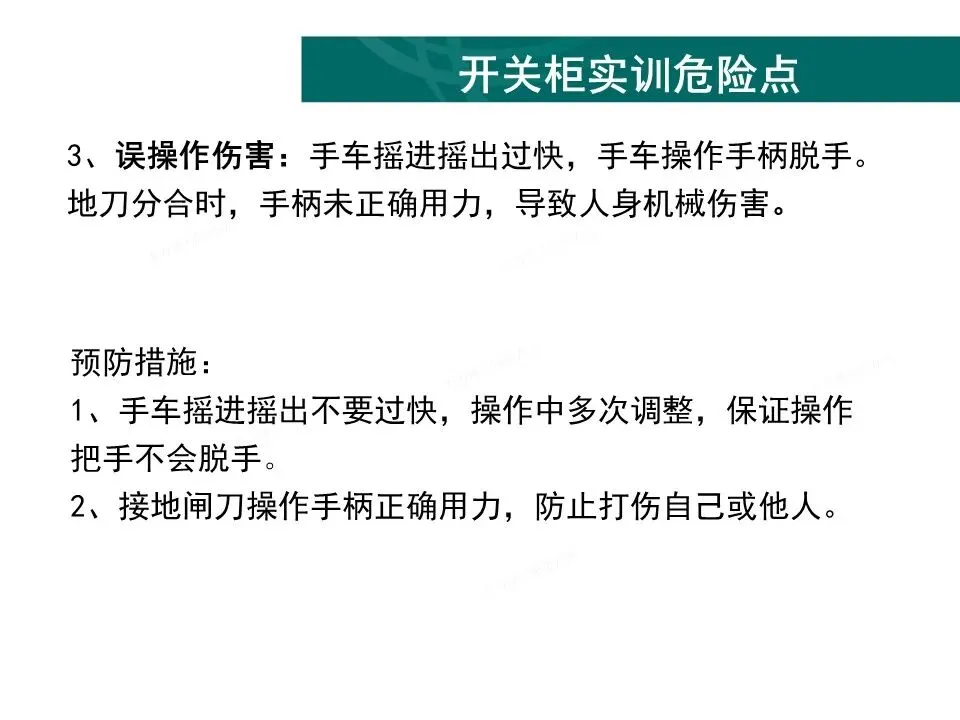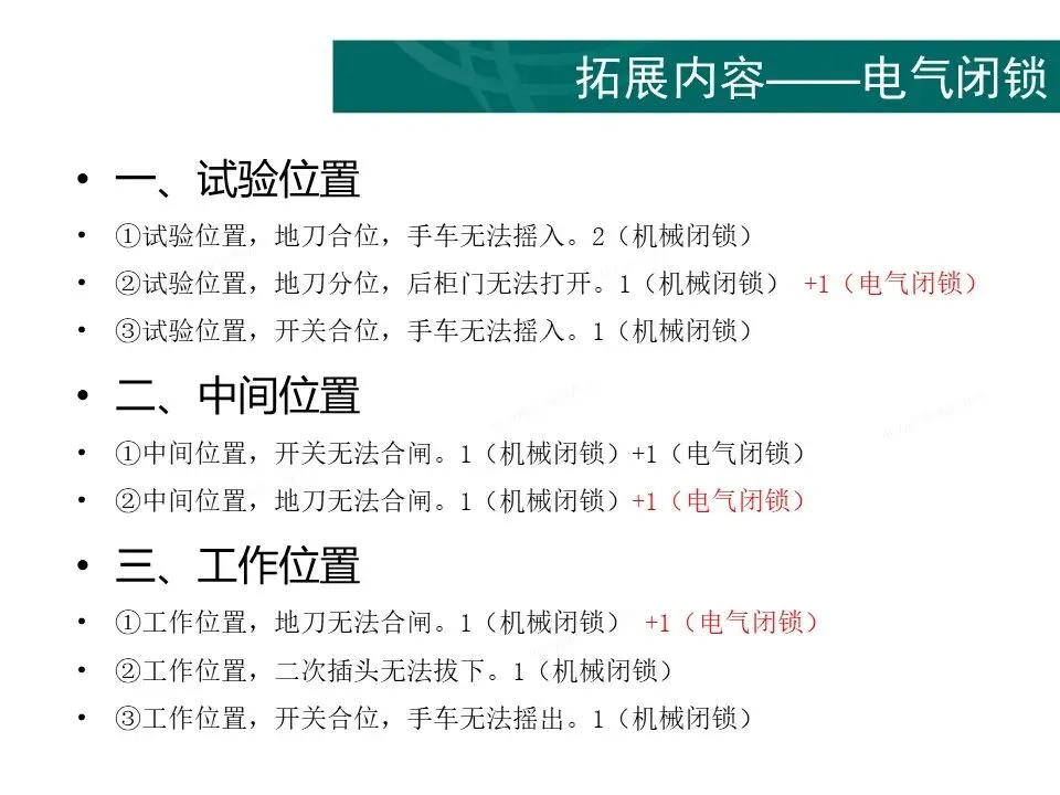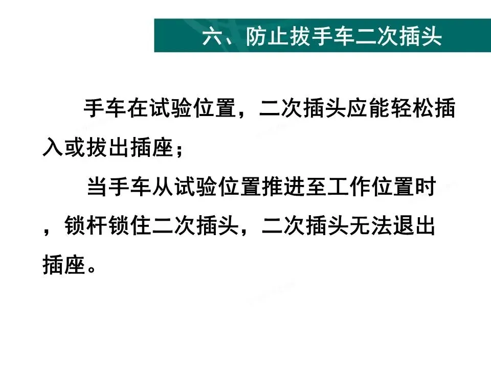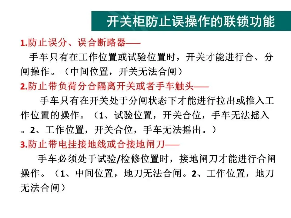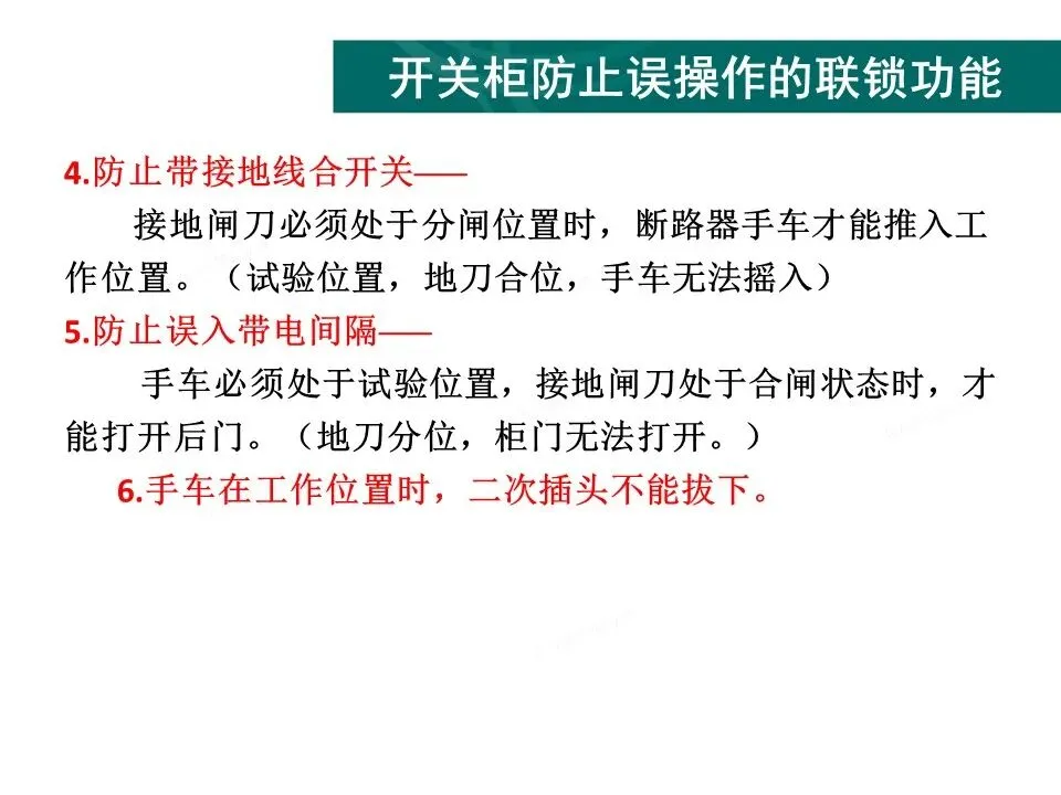 手车只有在开关处于分闸状态下才能进行拉出或推入工作位置的操作。(1、试验位置,开关合位,手车无法摇入。2、工作位置,开关合位,手车无法摇出。)