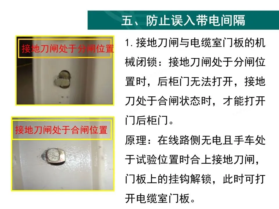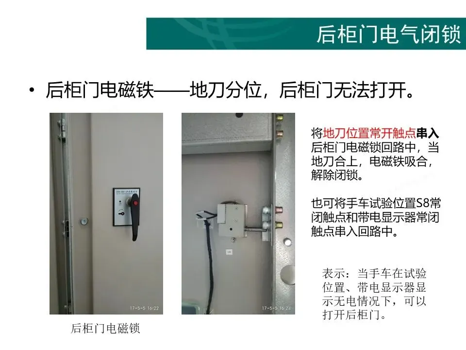 手车必须处于试验位置,接地闸刀处于合闸状态时,才能打开后门。(地刀分位,柜门无法打开。)