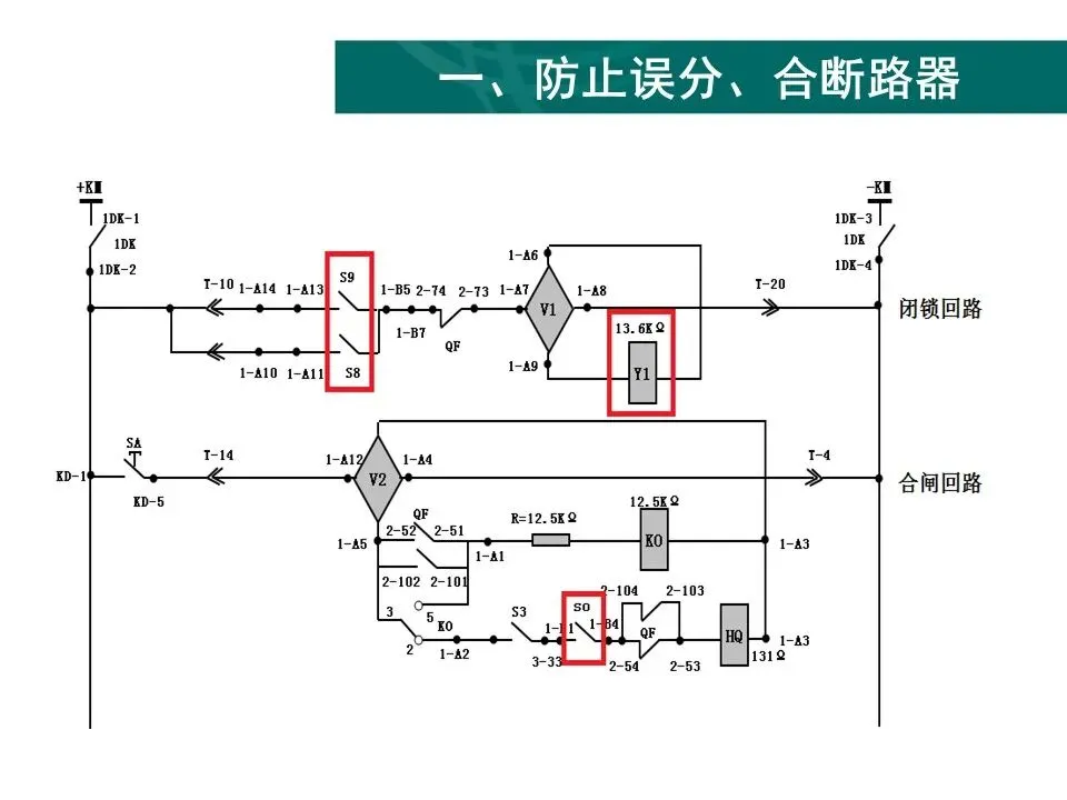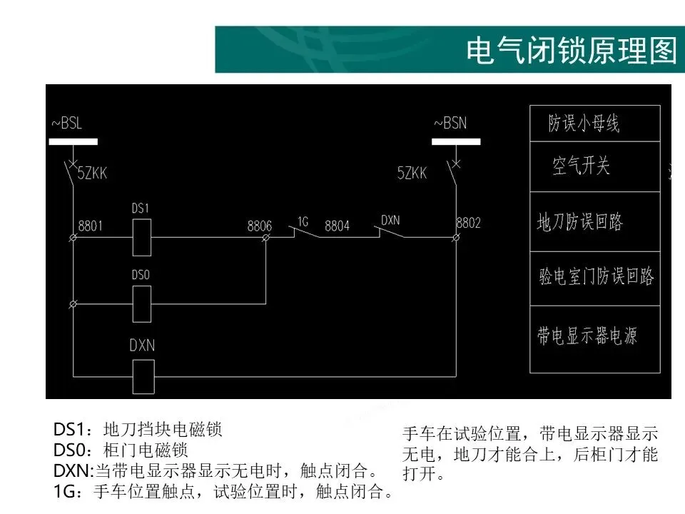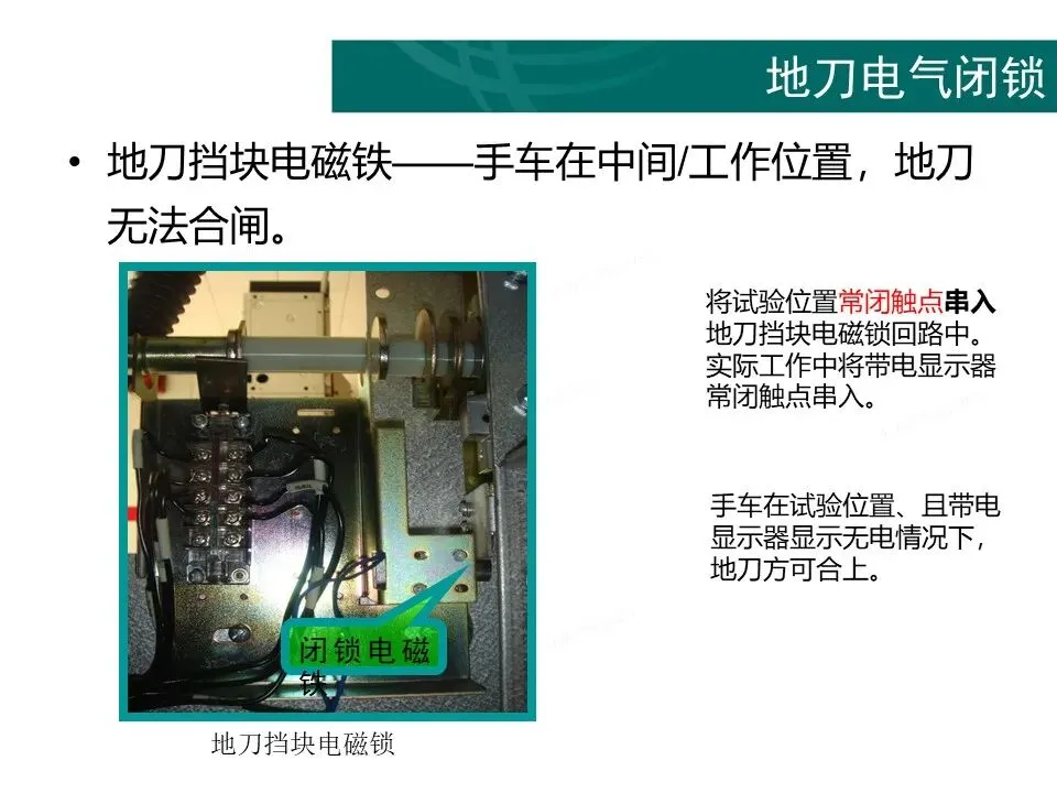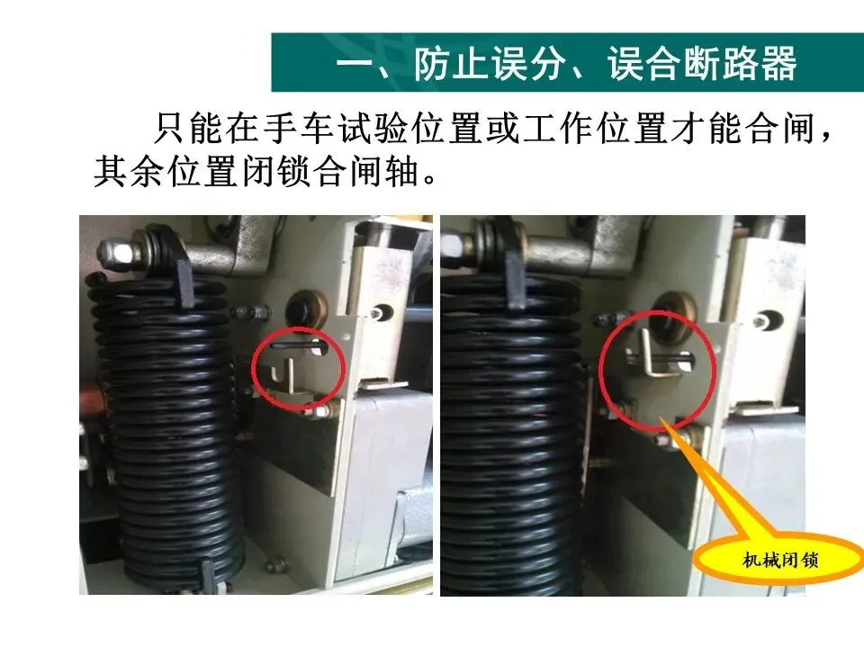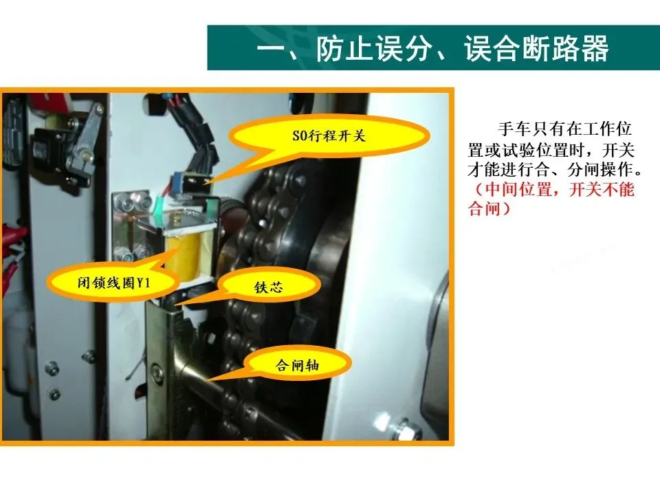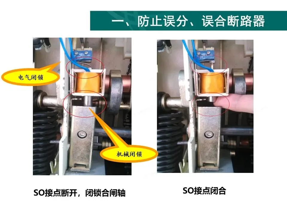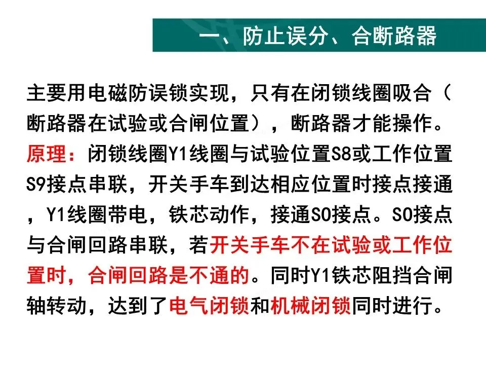 主要用电磁防误锁实现,只有在闭锁线圈吸合(断路器在试验或合闸位置),断路器才能操作。原理:闭锁线圈Y1线圈与试验位置S8或工作位置S9接点串联,开关手车到达相应位置时接点接通,Y1线圈带电,铁芯动作,接通SO接点。SO接点与合闸回路串联,若开关手车不在试验或工作位置时,合闸回路是不通的。同时Y1铁芯阻挡合闸轴转动,达到了电气闭锁和机械闭锁同时进行。
