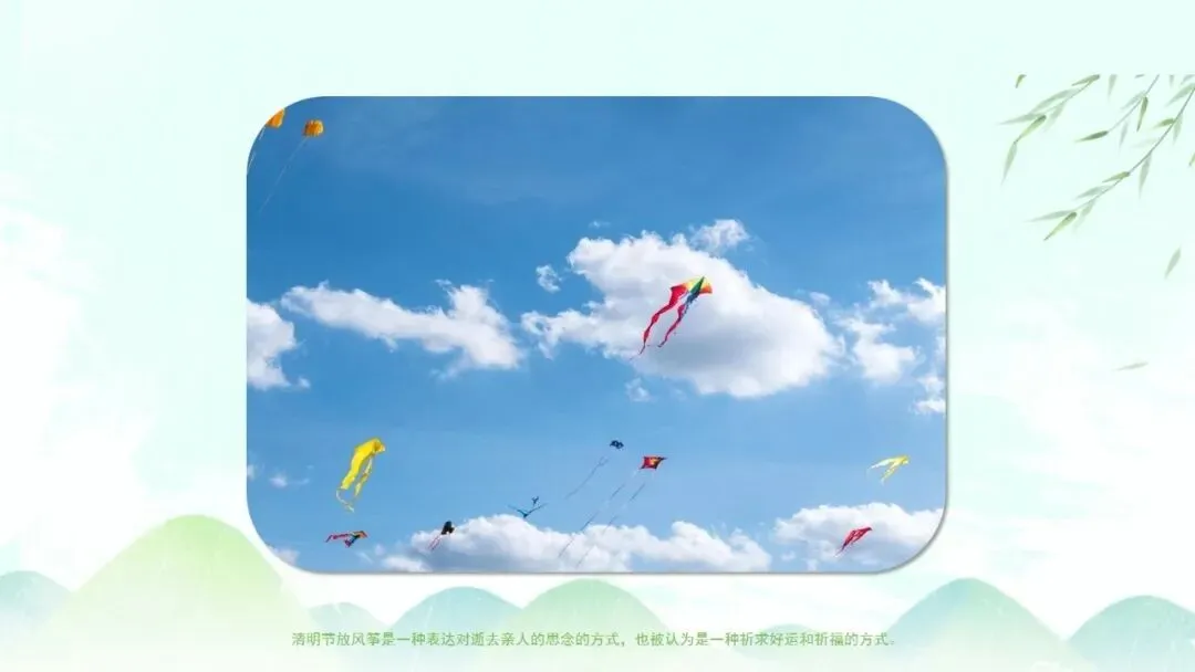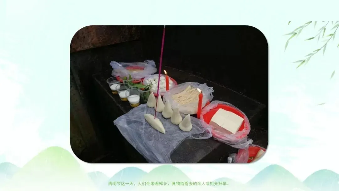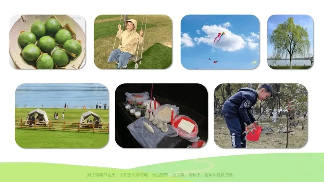 小结:到了清明节这天,人们会吃清明粿、外出踏青、放风筝、荡秋千、植树和祭祖扫墓。