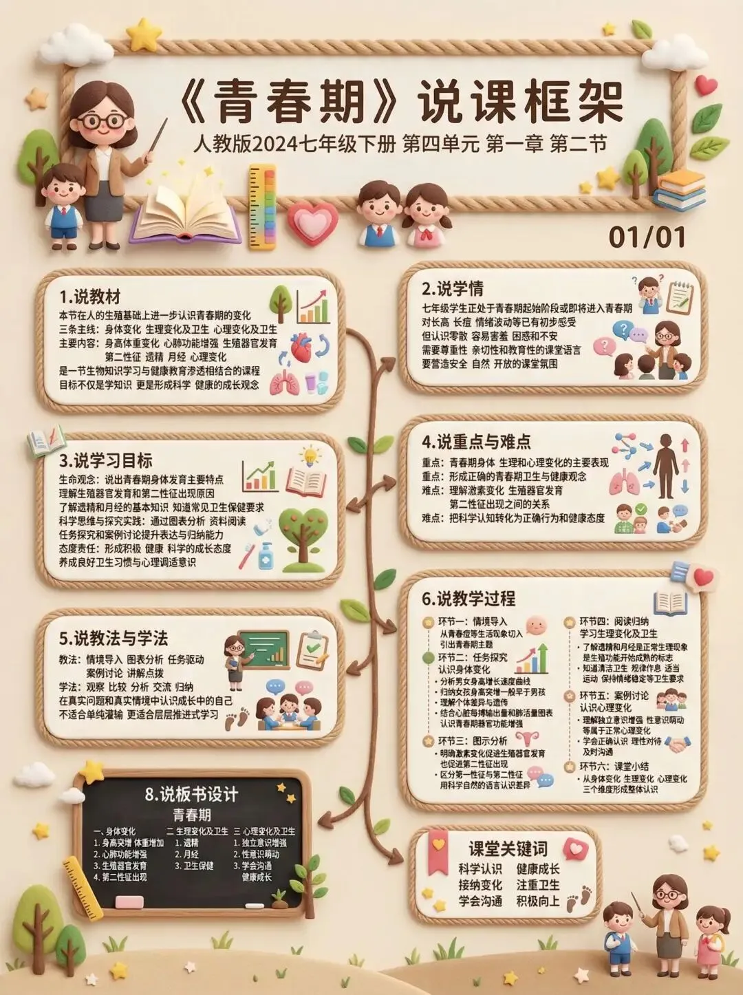这一期和大家分享的是人教版2024七年级下册第四单元第一章第二节《青春期》的课件思路与说课框架。