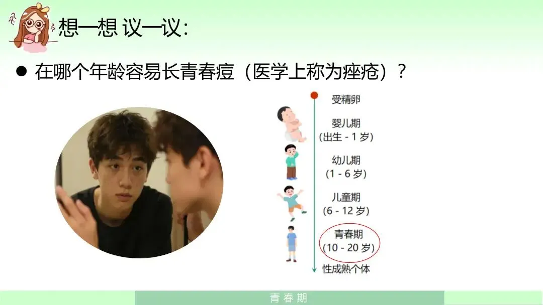 我会先从学生熟悉的生活现象入手,比如课件中的问题“在哪个年龄容易长青春痘”,引导学生联系自身体验,说出青春期是一个身体迅速变化的特殊时期。这样导入贴近生活,容易调动学生兴趣,也能自然引出本节主题《青春期》。