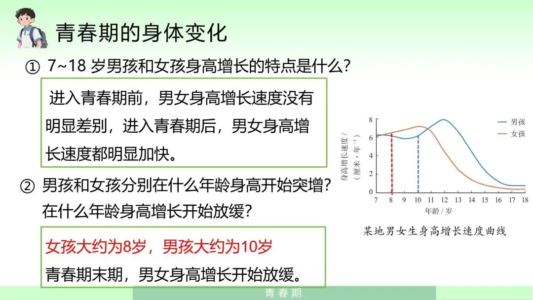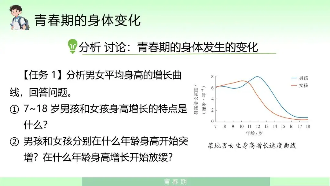 第一步,组织学生分析男女身高增长速度曲线。引导学生观察男孩和女孩身高增长的共同点与差异,得出“进入青春期前差别不明显,进入青春期后身高增长明显加快;女孩身高突增大约早于男孩,青春期末期增长放缓”的结论。