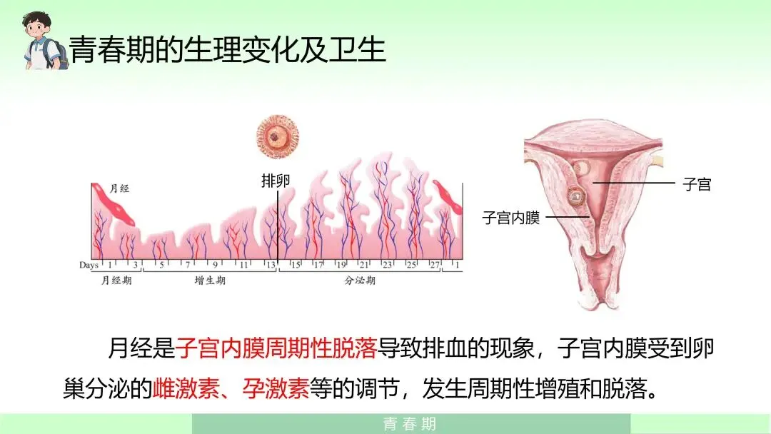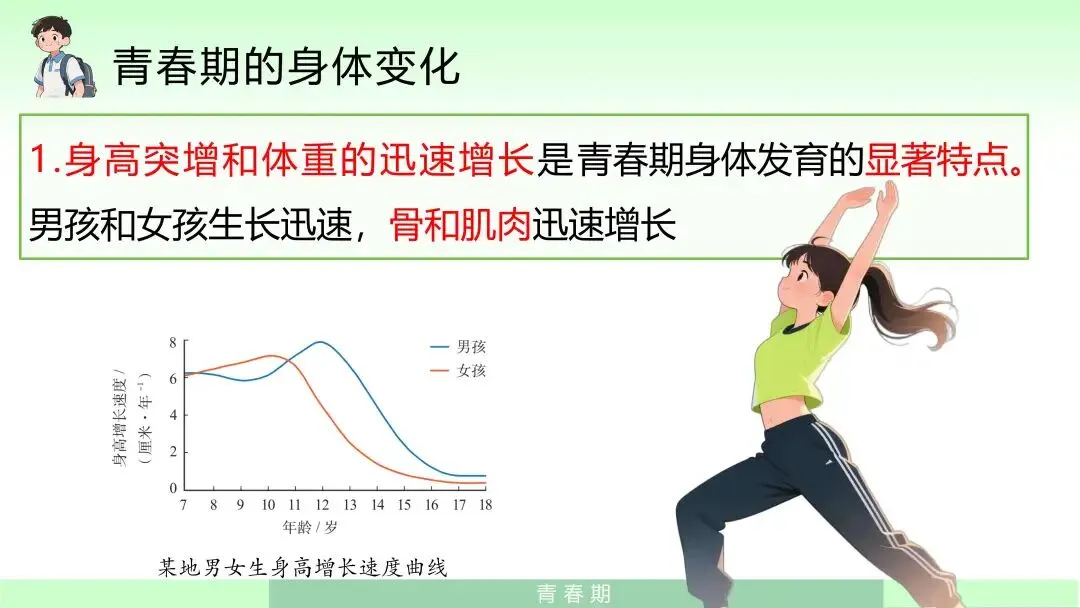 这一课是初中生物中非常重要的一节内容。它不仅帮助学生认识青春期身体和心理上的变化,也承担着青春期健康教育、卫生习惯养成和正确价值观引导的重要任务。课件整体设计紧扣学生真实生活,从“青春痘”“长高”“遗精”“月经”“心理变化”等学生最关心的话题切入,通过图表分析、资料阅读、案例讨论和卫生指导,引导学生科学认识青春期、积极面对成长、健康度过这一人生的重要阶段。