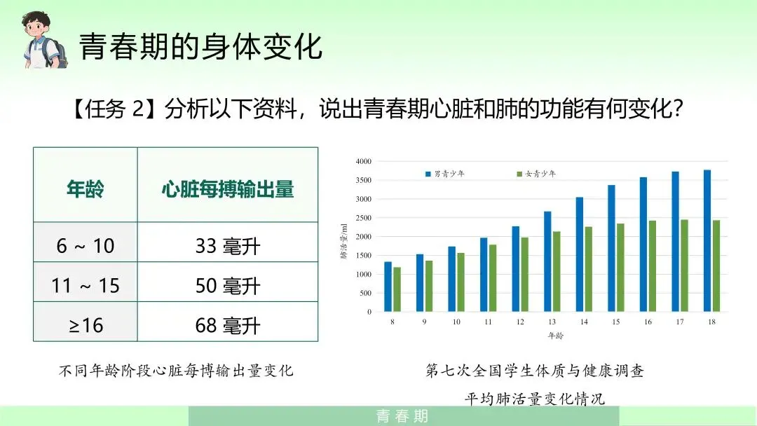 第三步,借助心脏每搏输出量、肺活量图表,归纳青春期不仅外形变化明显,神经系统、心脏和肺等器官功能也在显著增强,从而帮助学生建立“青春期是身心同步发展时期”的整体认识。
