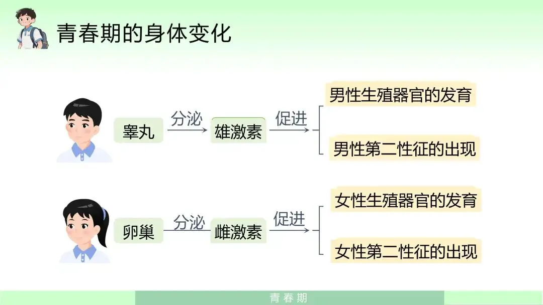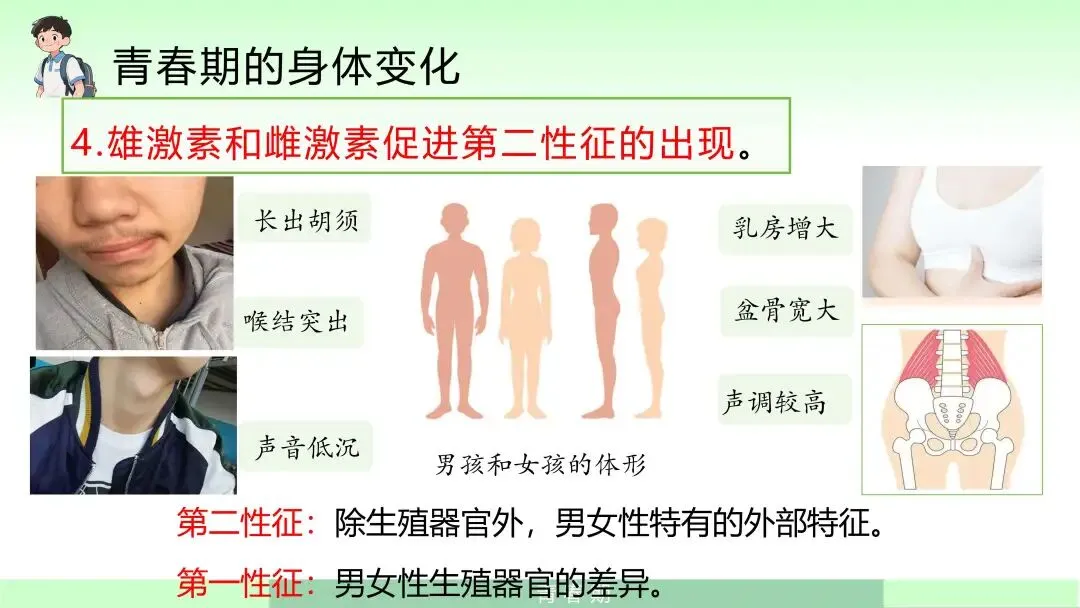 在这一部分,我会结合教材图示进行讲解,引导学生明确:进入青春期后,男生和女生的生殖器官逐渐发育成熟,睾丸和卵巢开始分泌相关激素。这些激素不仅促进生殖器官进一步发育,也会使人体出现第二性征。