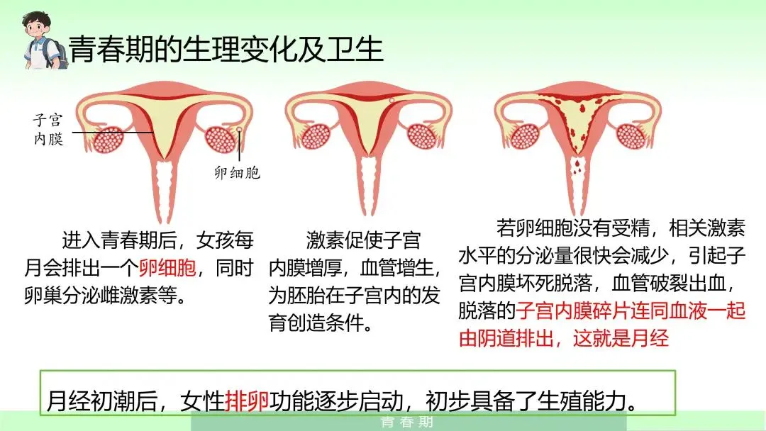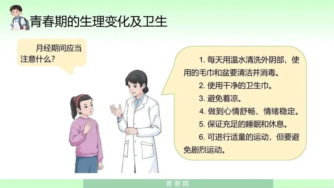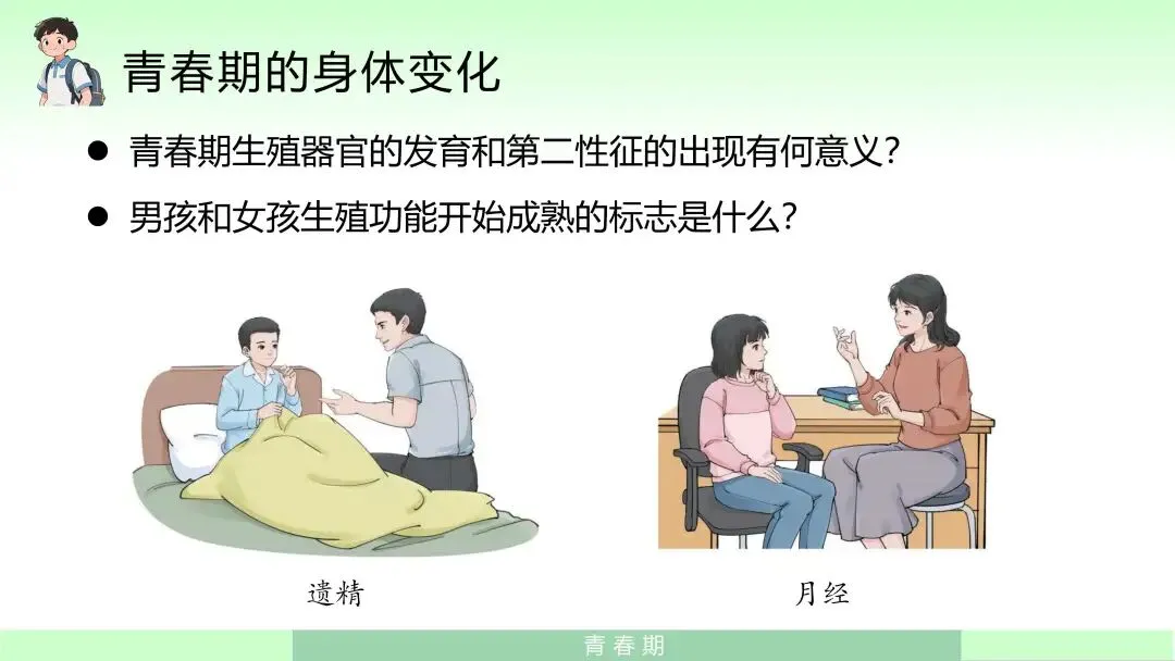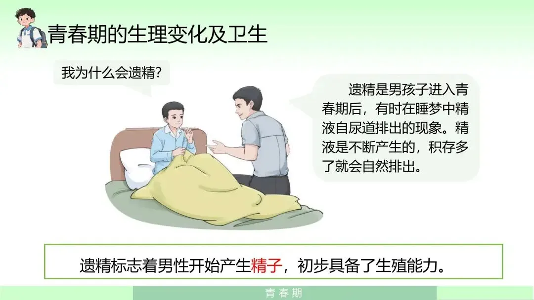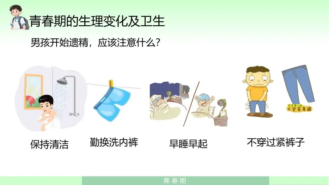 学生在阅读和讨论后,我会进行归纳。遗精是男孩进入青春期后可能出现的一种正常生理现象;月经是女孩青春期常见的正常生理现象,它们都说明个体已经开始具备生殖功能成熟的基础。这些变化并不可怕,也不需要过度紧张,而应该以平常心正确面对。
