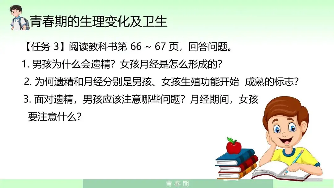 这一部分可结合课件中的“任务3”展开。先让学生阅读教材相关内容,再围绕三个问题展开交流:男孩为什么会遗精,女孩月经是怎样形成的;为什么遗精和月经分别是男孩、女孩生殖功能开始成熟的标志;面对这些变化应注意哪些卫生问题。