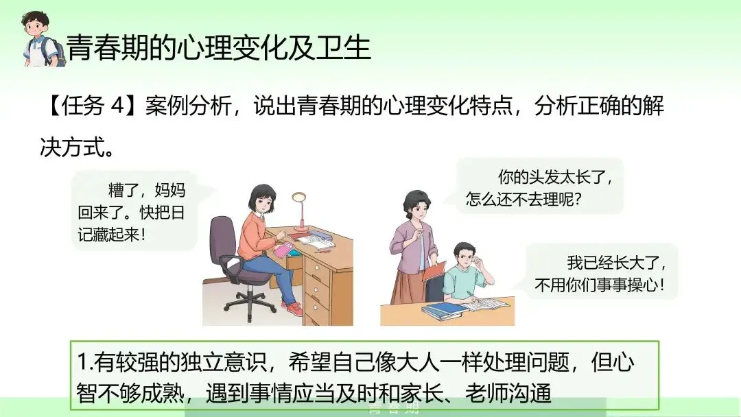教师可借助课件中的情境,如“我已经长大了,不用你们事事操心”等案例,引导学生分析青春期的心理特点。帮助学生明确:青春期常常表现出独立意识增强、希望像大人一样处理事情,但心智尚未完全成熟;同时,性意识开始萌动,从最初与异性疏远,到逐渐愿意接近异性或产生朦胧好感,这些都属于正常心理变化。关键在于正确认识、理性对待、及时沟通。