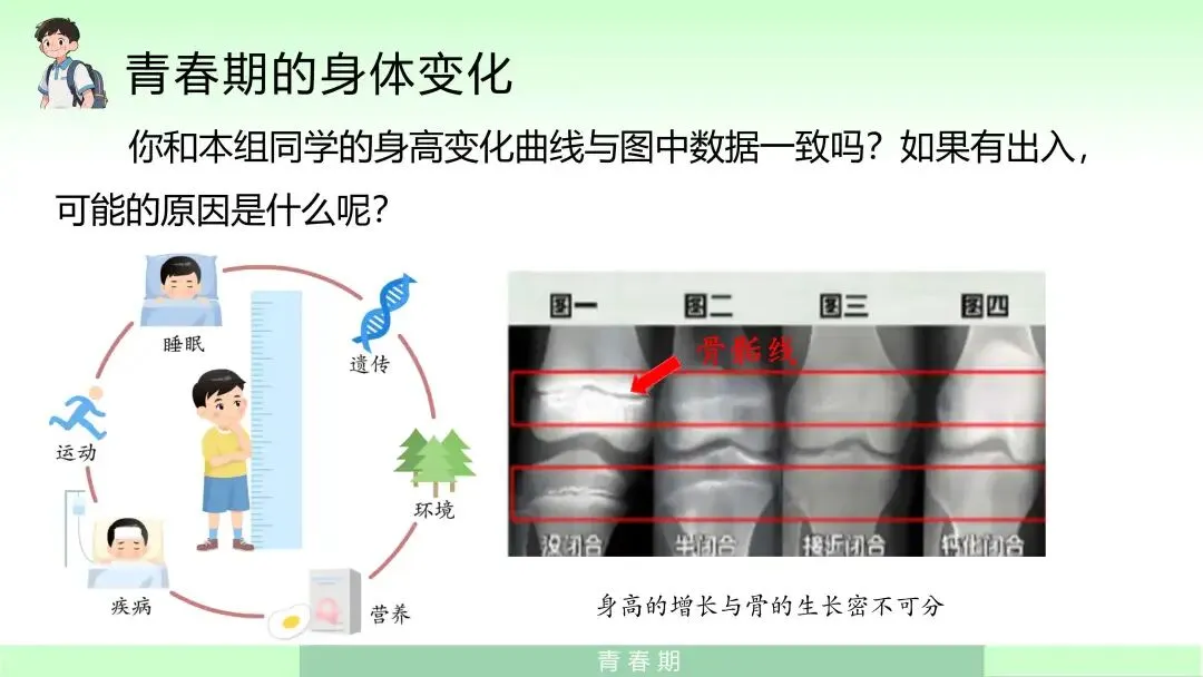 通过这一追问,引导学生认识到,人的生长发育既有一般规律,也存在个体差异,这种差异可能和遗传、营养、运动、作息等因素有关。这样既培养学生分析问题的能力,也帮助他们树立正确认识,避免简单比较、盲目焦虑。