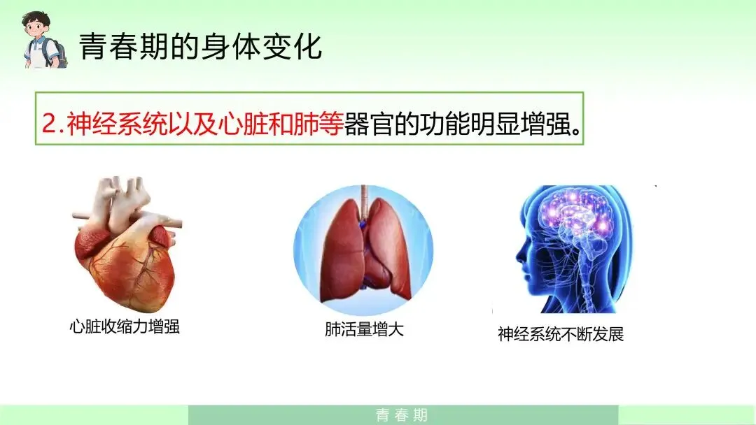 从课件内容来看,本节主要包括三条主线。第一条主线是青春期的身体变化,如身高突增、体重迅速增长、心脏和肺等器官功能增强、生殖器官发育和第二性征出现;第二条主线是青春期的生理变化及卫生,如遗精、月经的形成及卫生保健;第三条主线是青春期的心理变化及卫生,如独立意识增强、性意识萌动,以及如何通过与家长、老师沟通来健康成长。