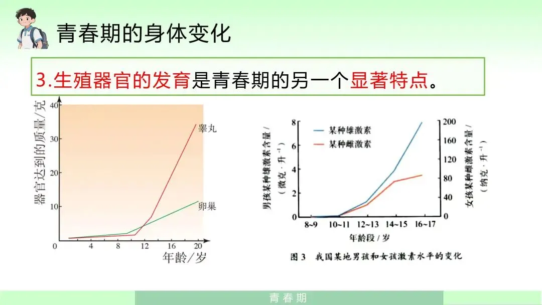 教师引导学生观察课件中的图示和曲线,认识青春期生殖器官的发育是另一显著特点,并理解睾丸和卵巢分泌激素后,会促进生殖器官进一步发育,也会促进第二性征出现。在此基础上,帮助学生区分“第一性征”和“第二性征”,并用科学、自然的语言认识男女性在青春期的差异。