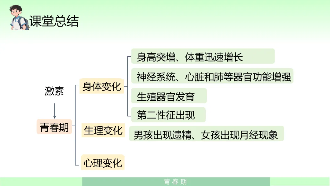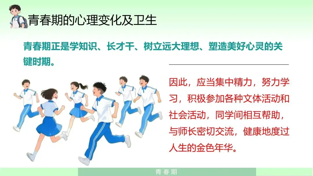 最后,我会用一句总结性的话结束本节课:青春期是人生中非常宝贵的发展阶段,是我们长身体、长知识、长本领的重要时期。希望每一位同学都能用科学、健康、积极的态度面对青春期,成为更好的自己。