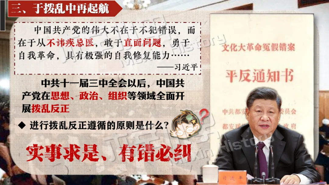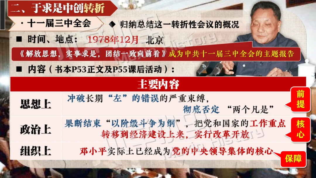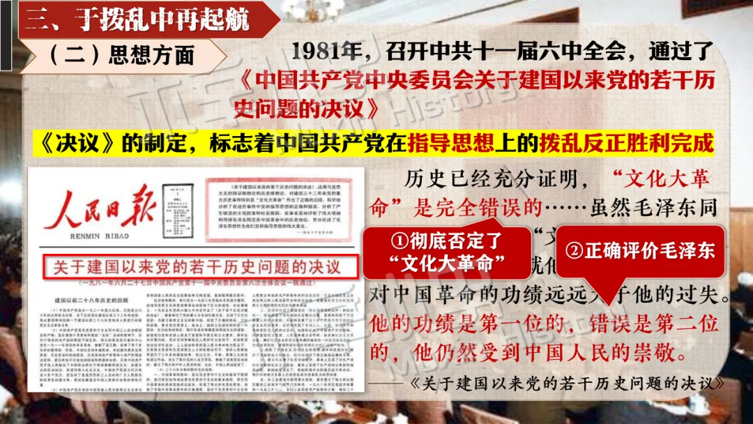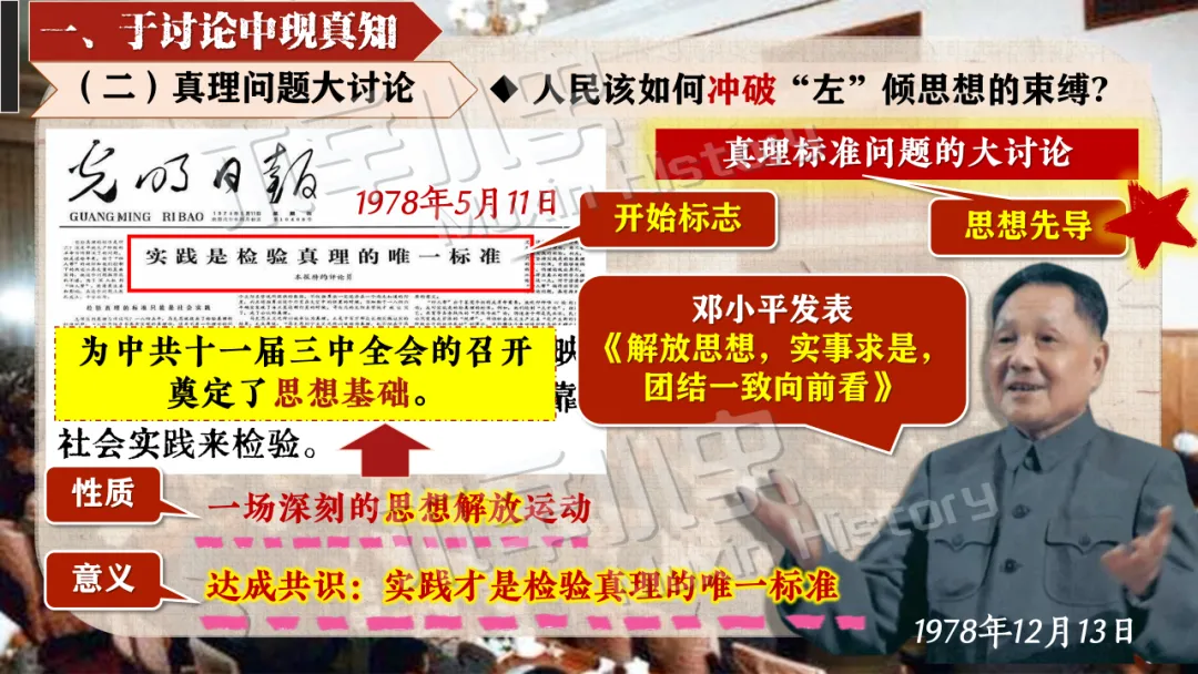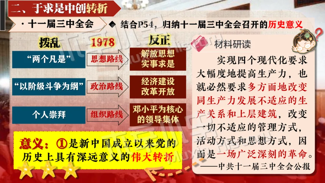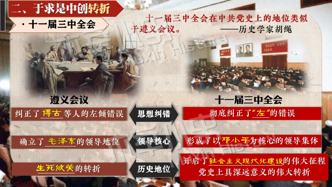 十一届三中全会彻底冲破长期 “左” 的错误束缚,重新确立解放思想、实事求是的马克思主义思想路线。金冲及也曾指出:“十一届三中全会最大的贡献,就是从思想路线上完成拨乱反正,为中国的发展打开了全新的道路。” 这一转变结束了教条主义的束缚,实现了党在思想层面的伟大觉醒。