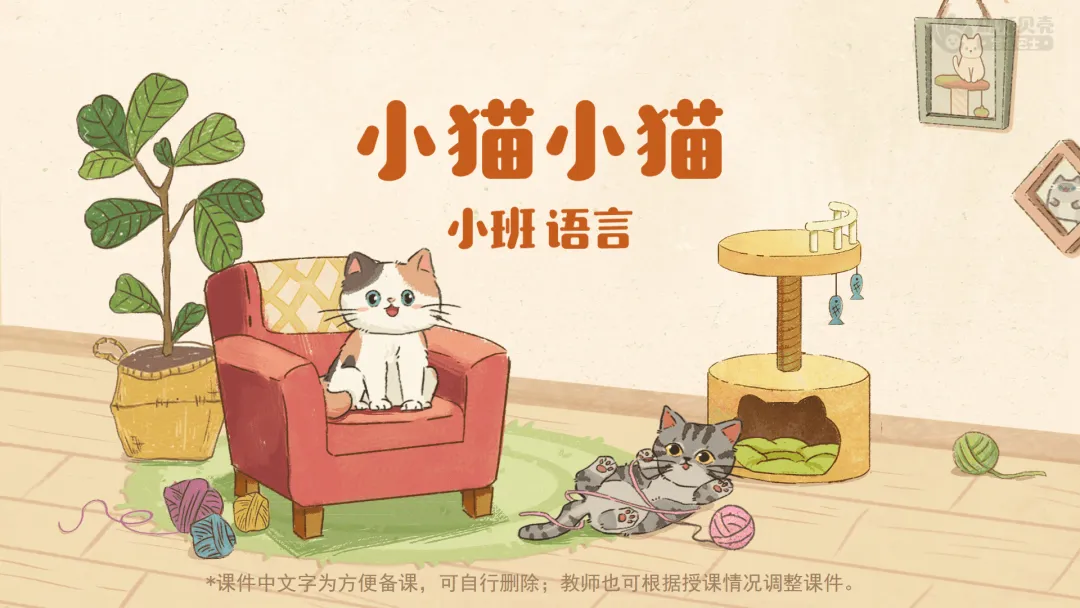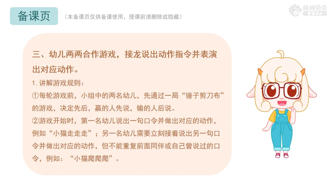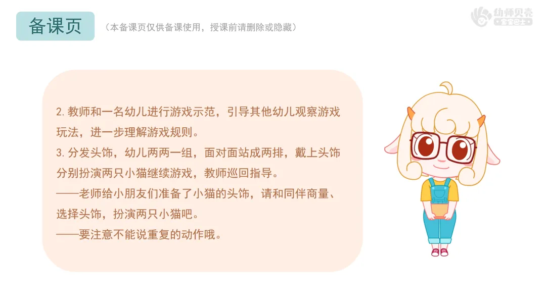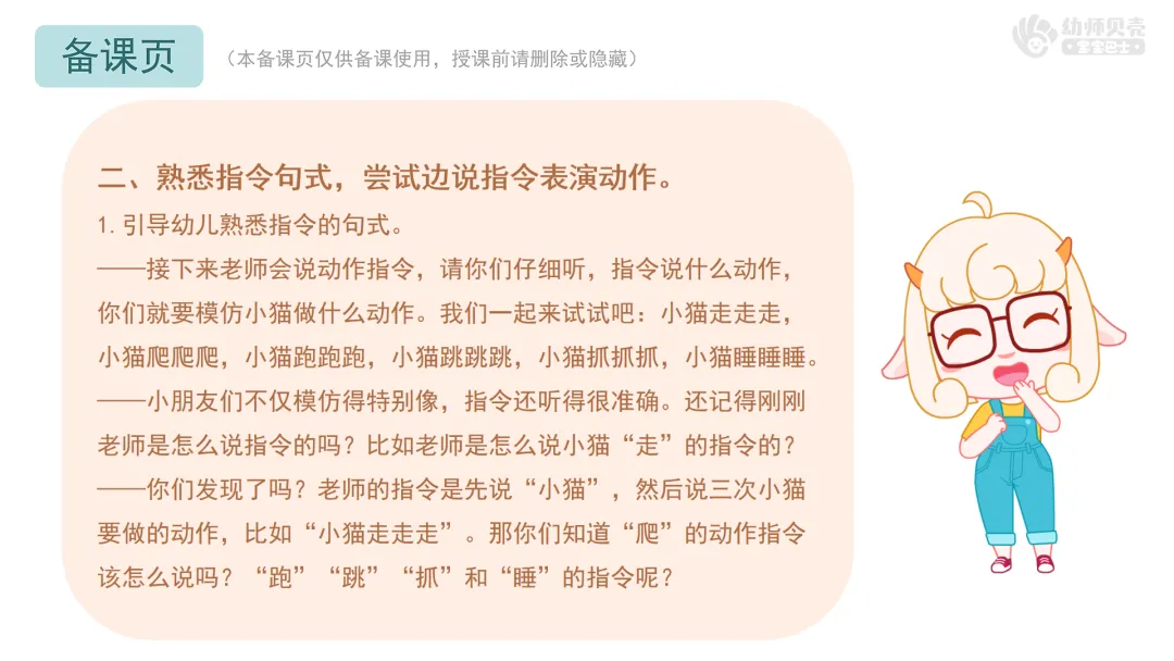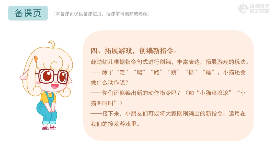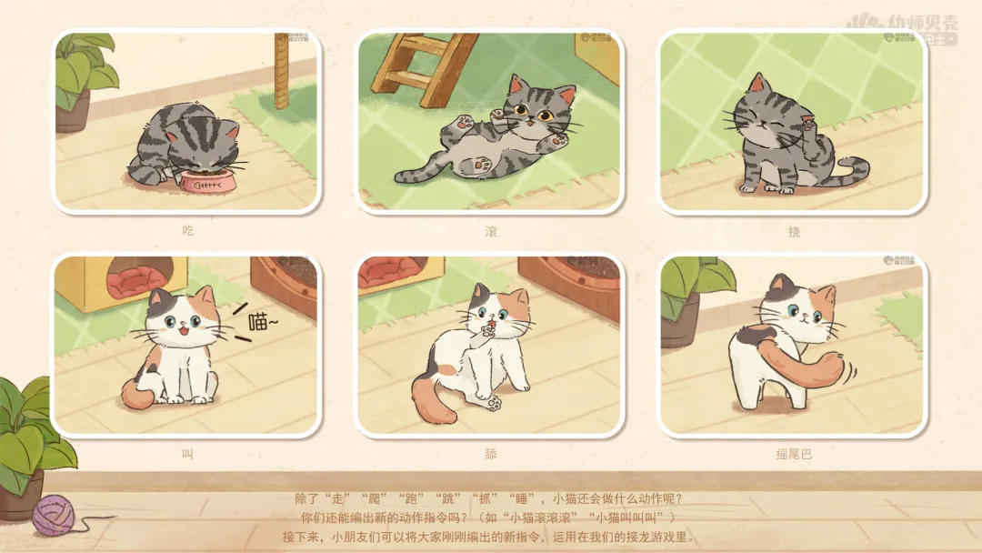 ——你们发现了吗?老师的指令是先说“小猫”,然后说三次小猫要做的动作,比如“小猫走走走”。那你们知道“爬”的动作指令该怎么说吗?“跑”“跳”“抓”和“睡”的指令呢?