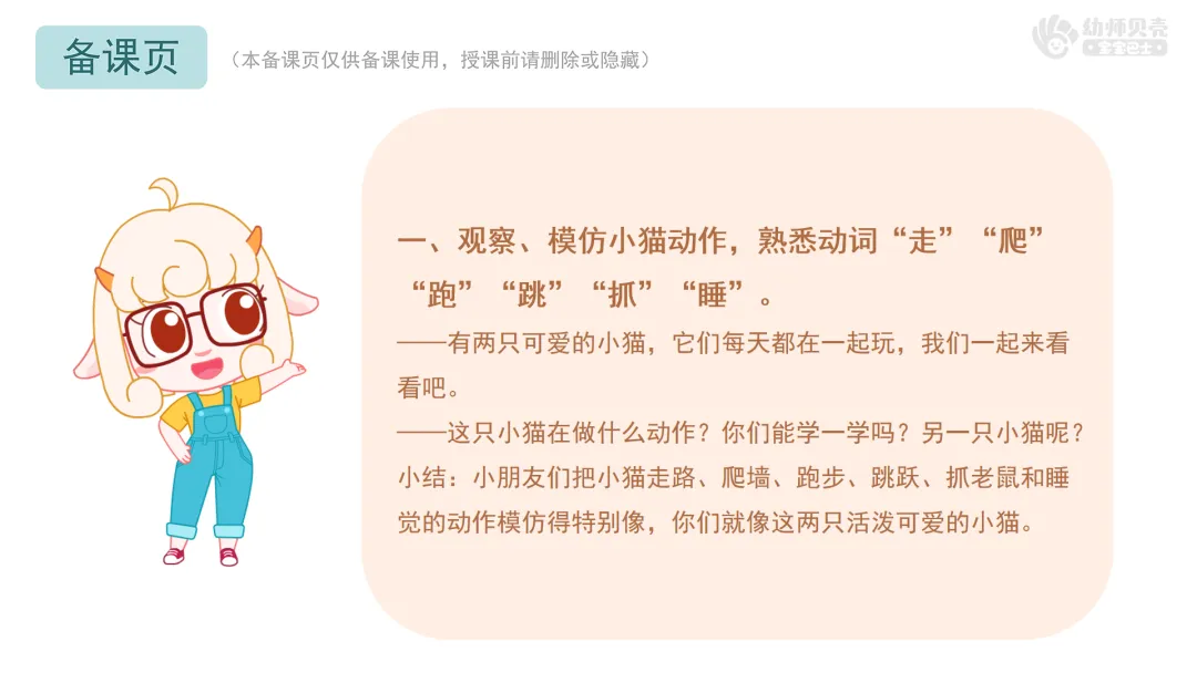 一、观察、模仿小猫动作,熟悉动词“走”“爬”“跑”“跳”“抓”“睡”。