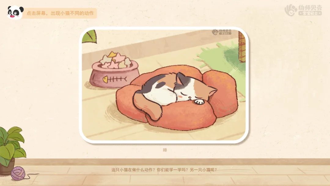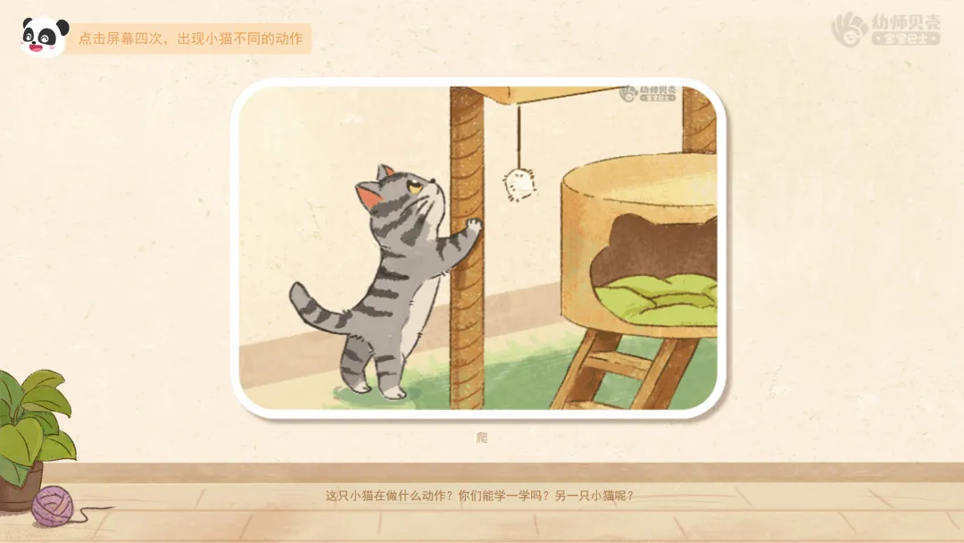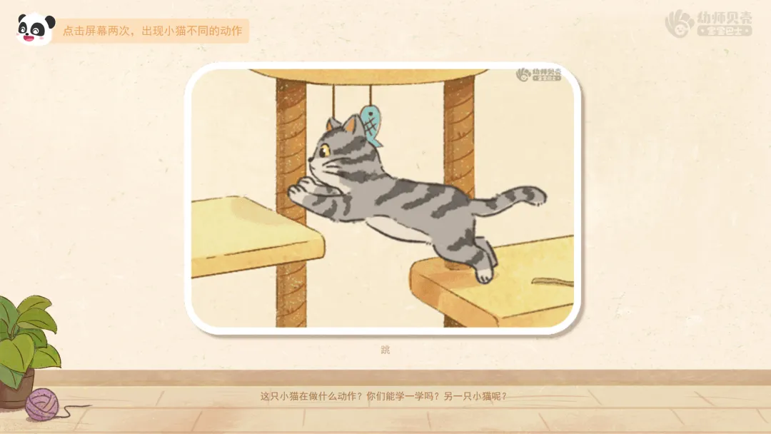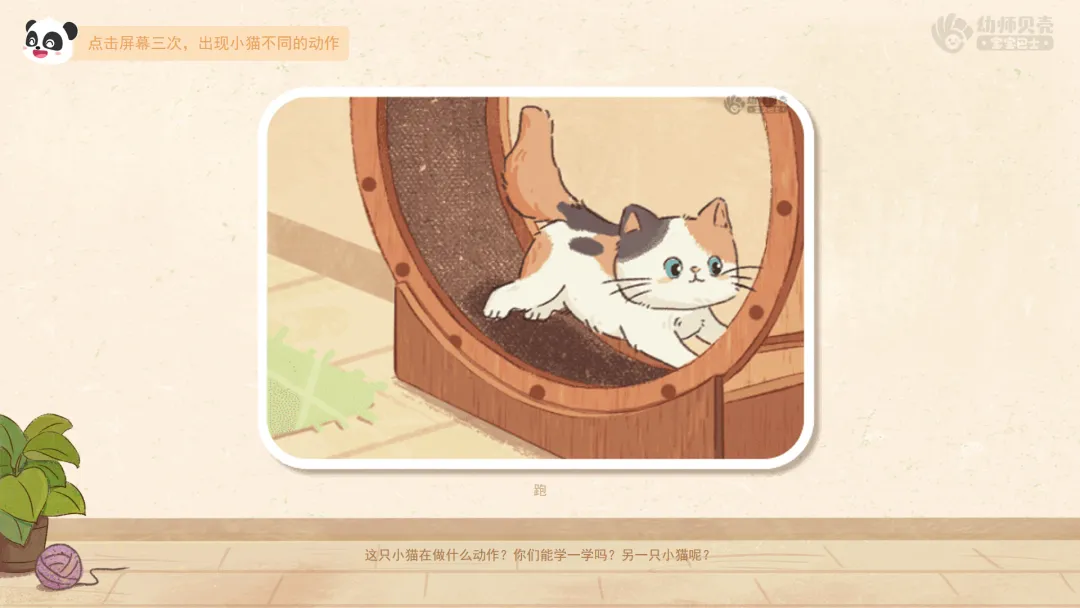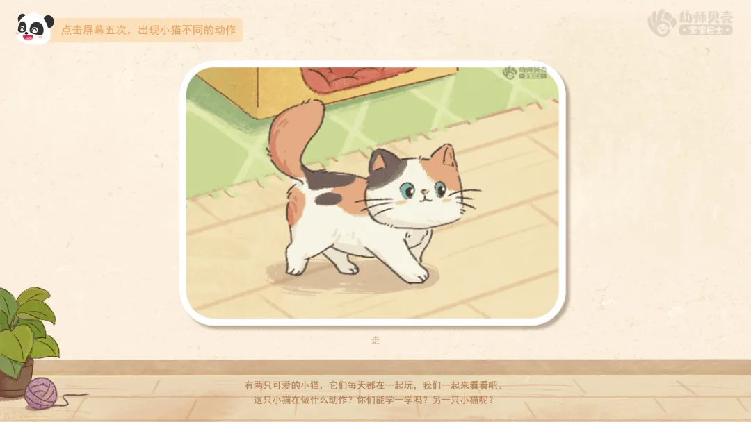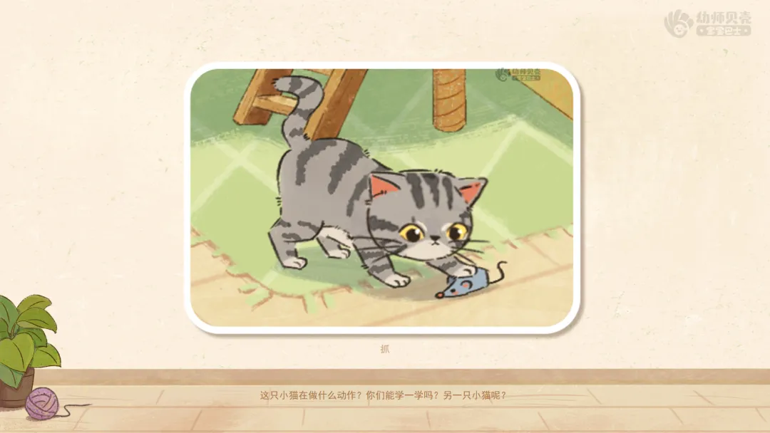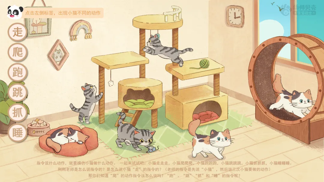 l学说“走”“爬”“跑”“跳”“抓”“睡”等动词的指令,并模仿小猫做出相应的动作。