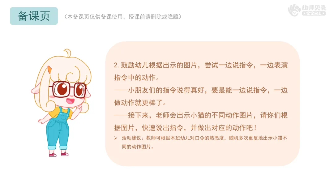 Ø活动建议:教师可根据本班幼儿对口令的熟悉度,随机多次重复地出示小猫不同的动作图片。