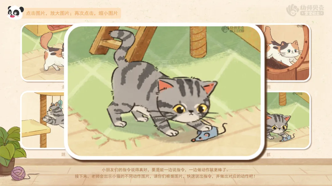——接下来,老师会出示小猫的不同动作图片,请你们根据图片,快速说出指令,并做出对应的动作吧!
