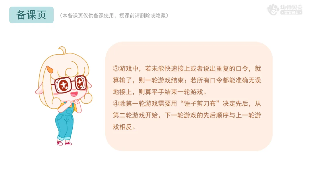 ③游戏中,若未能快速接上或者说出重复的口令,就算输了,则一轮游戏结束;若所有口令都能准确无误地接上,则算平手结束一轮游戏。