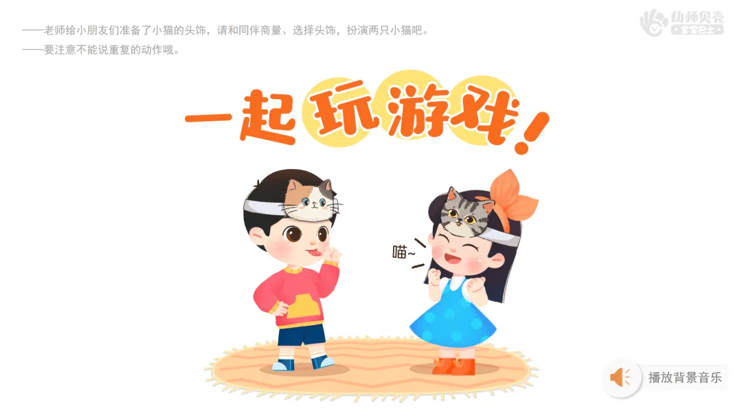 ——老师给小朋友们准备了小猫的头饰,请和同伴商量、选择头饰,扮演两只小猫吧。
