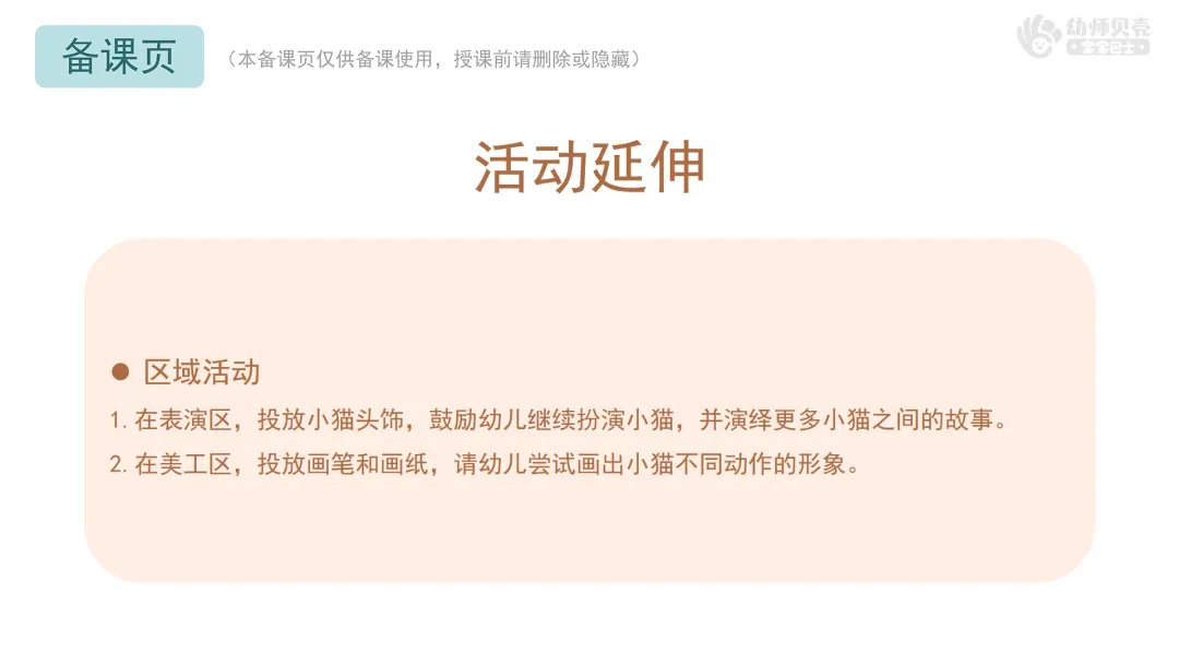 1.在表演区,投放小猫头饰,鼓励幼儿继续扮演小猫,并演绎更多小猫之间的故事。