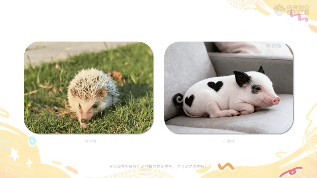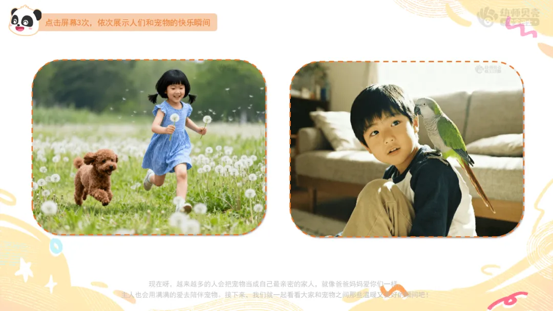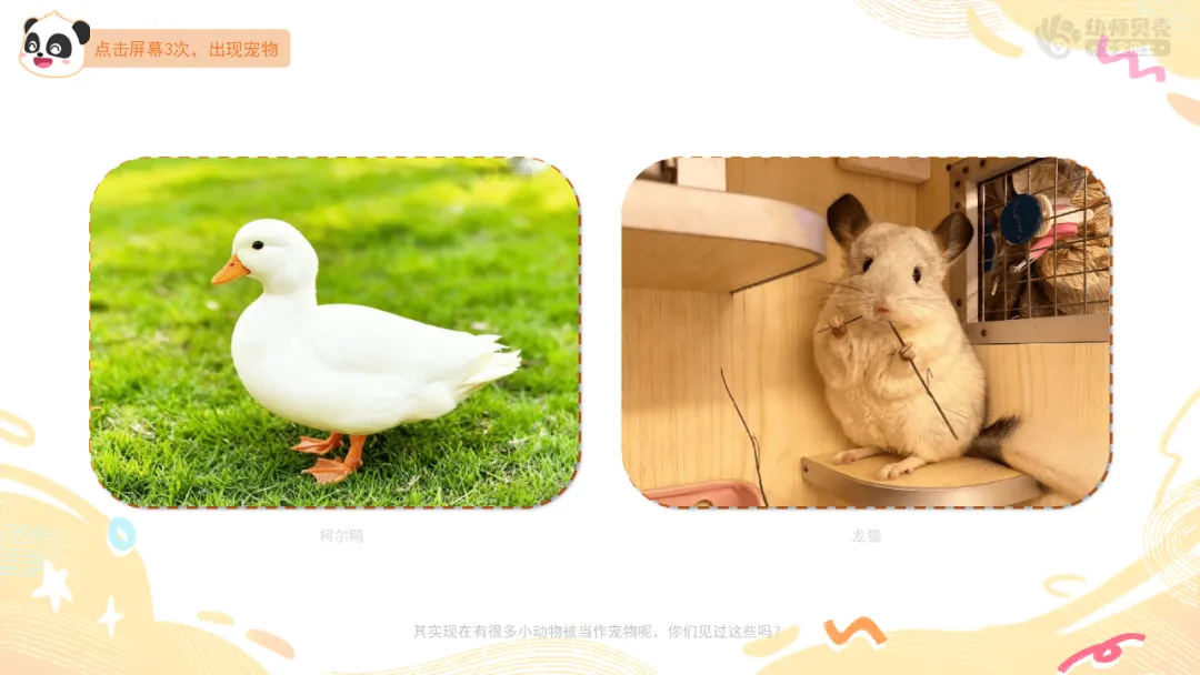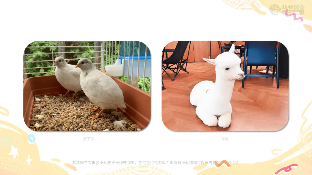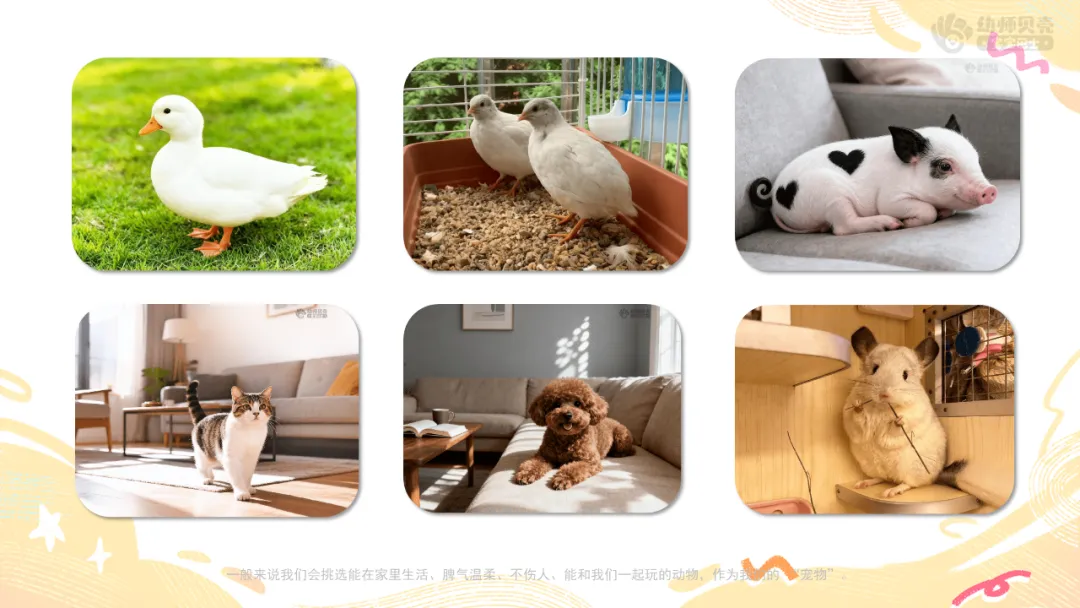 Ø活动建议:教师可提前收集班级幼儿与自家宠物的合照,将本环节通用图片替换为这些更具亲切感的素材,让幼儿在画面中看到自己或同伴的身影,进一步激发对宠物的喜爱之情。