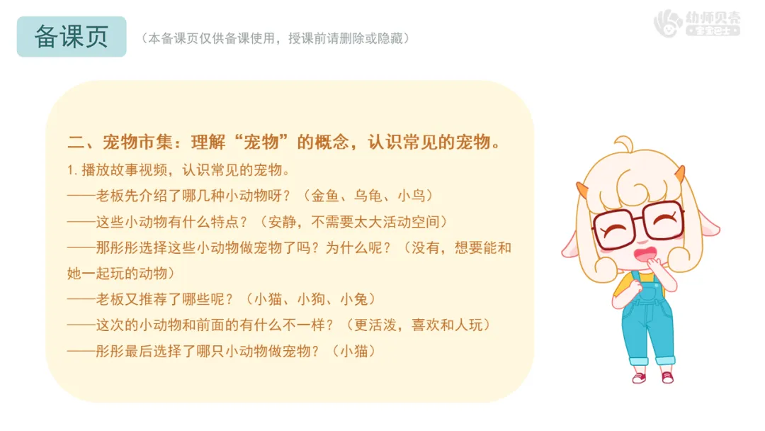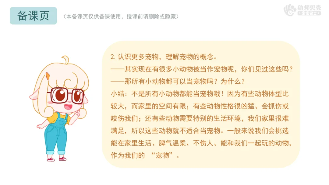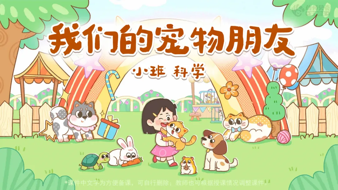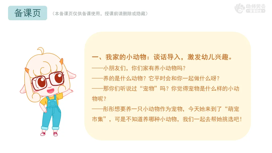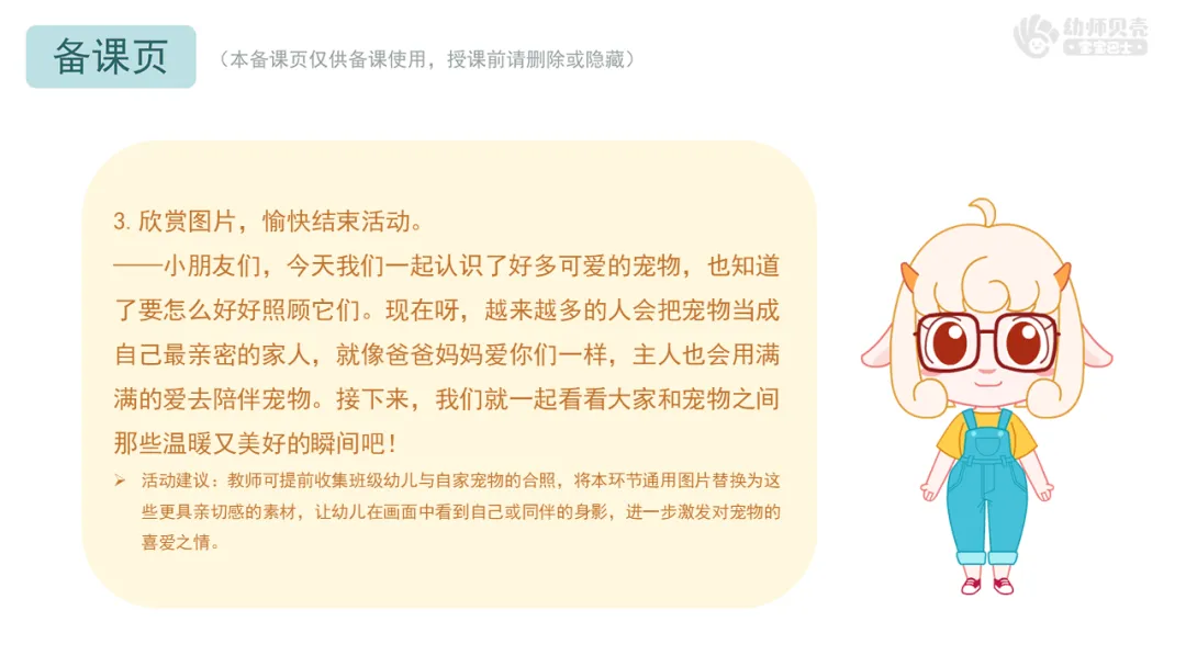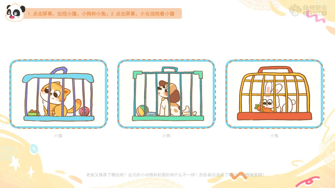 Ø活动建议:教师可提前收集班级幼儿与自家宠物的合照,将本环节通用图片替换为这些更具亲切感的素材,让幼儿在画面中看到自己或同伴的身影,进一步激发对宠物的喜爱之情。