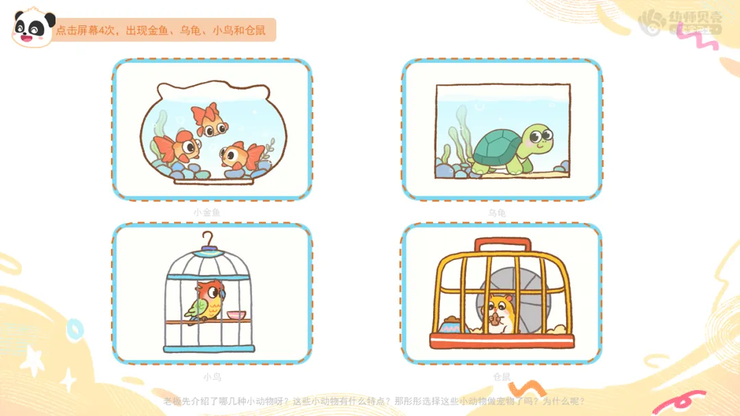 ——老板先介绍了哪几种小动物呀?(金鱼、乌龟、小鸟、小仓鼠)