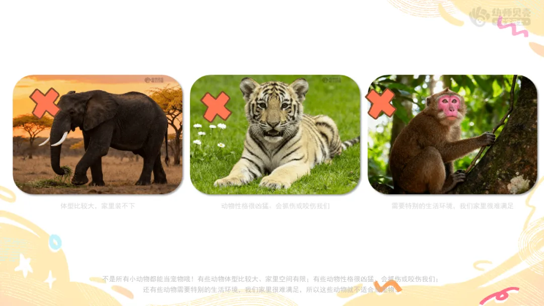 小结:不是所有小动物都能当宠物哦!有些动物体型比较大、而家里的空间有限;有些动物性格很凶猛、会抓伤或咬伤我们;还有些动物需要特别的生活环境,我们家里很难满足,所以这些动物就不适合当宠物。一般来说我们会挑选能在家里生活、脾气温柔、不伤人、能和我们一起玩的动物,作为我们的 “宠物”。