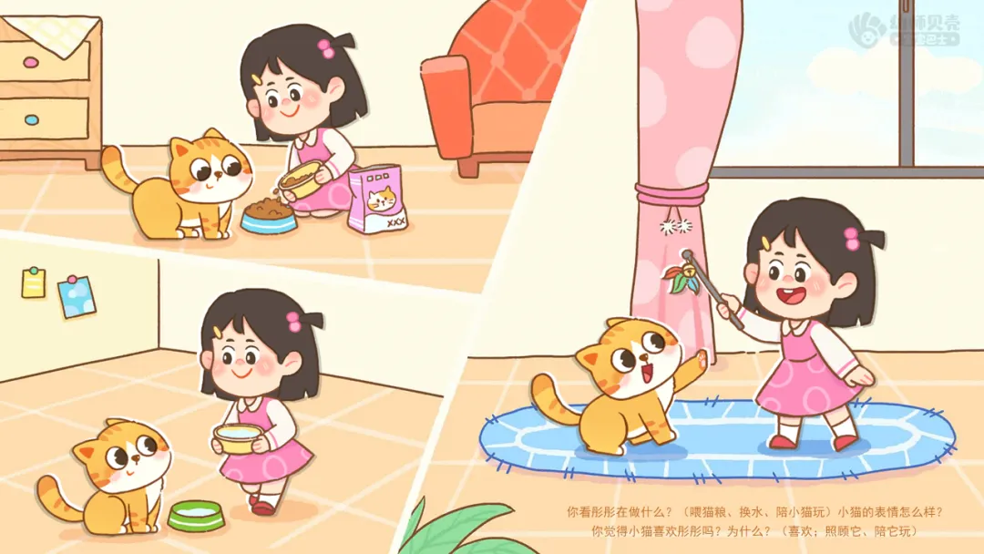 ——你看彤彤在做什么?(喂猫粮、换水、陪小猫玩)