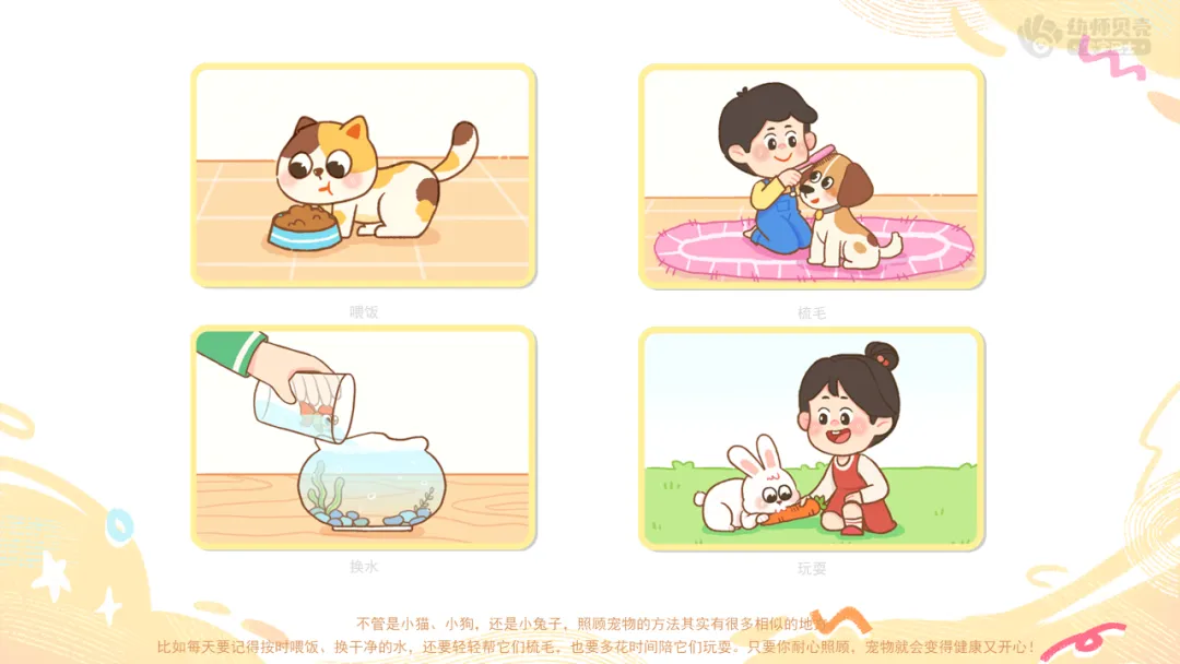 小结:不管是小猫、小狗,还是小兔子,照顾宠物的方法其实有很多相似的地方。比如每天要记得按时喂饭、换干净的水,还要轻轻帮它们梳毛,也要多花时间陪它们玩耍。只要你耐心照顾,宠物就会变得健康又开心!