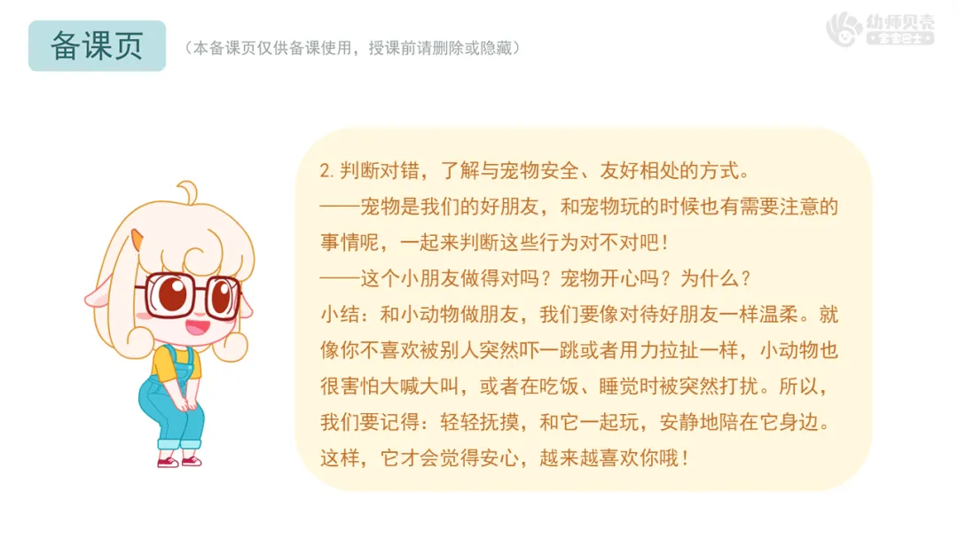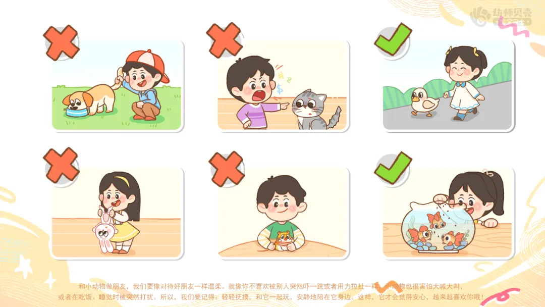 小结:和小动物做朋友,我们要像对待好朋友一样温柔。就像你不喜欢被别人突然吓一跳或者用力拉扯一样,小动物也很害怕大喊大叫,或者在吃饭、睡觉时被突然打扰。所以,我们要记得:轻轻抚摸,和它一起玩,安静地陪在它身边。这样,它才会觉得安心,越来越喜欢你哦!