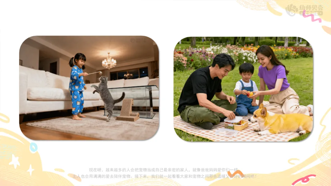 ——小朋友们,今天我们一起认识了好多可爱的宠物,也知道了要怎么好好照顾它们。现在呀,越来越多的人会把宠物当成自己最亲密的家人,就像爸爸妈妈爱你们一样,主人也会用满满的爱去陪伴宠物。接下来,我们就一起看看大家和宠物之间那些温暖又美好的瞬间吧!