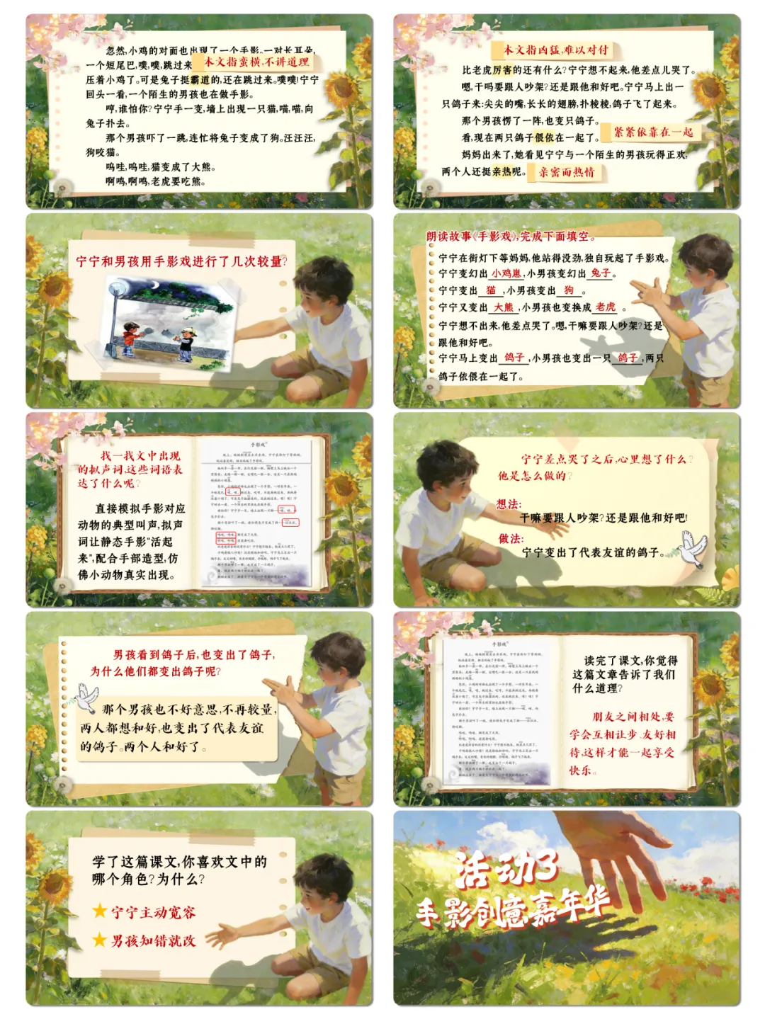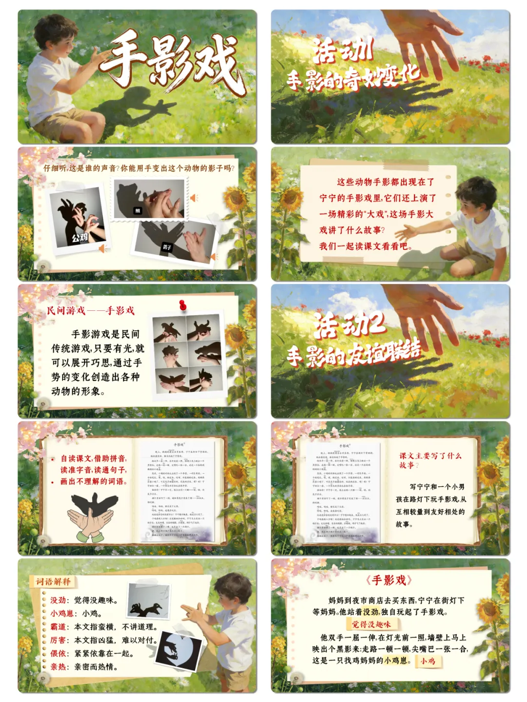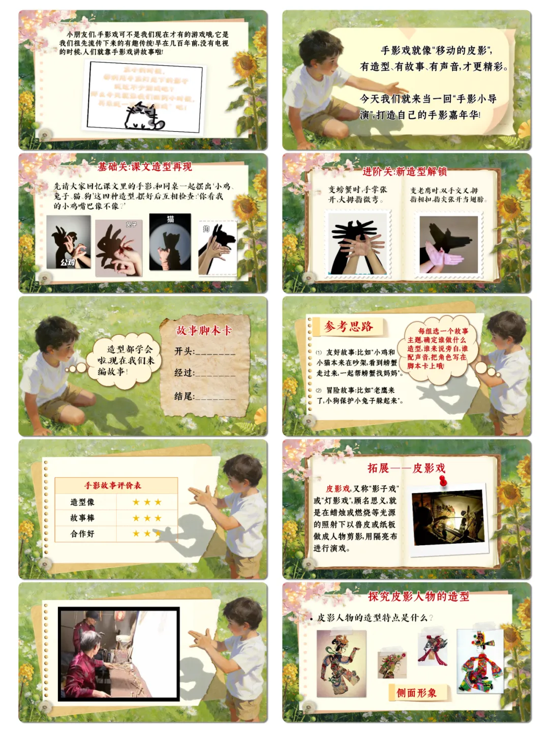 文化介绍:“手影游戏是民间传统游戏,只要有光,就可以展开巧思,通过手势的变化创造出各种动物的形象。”